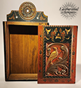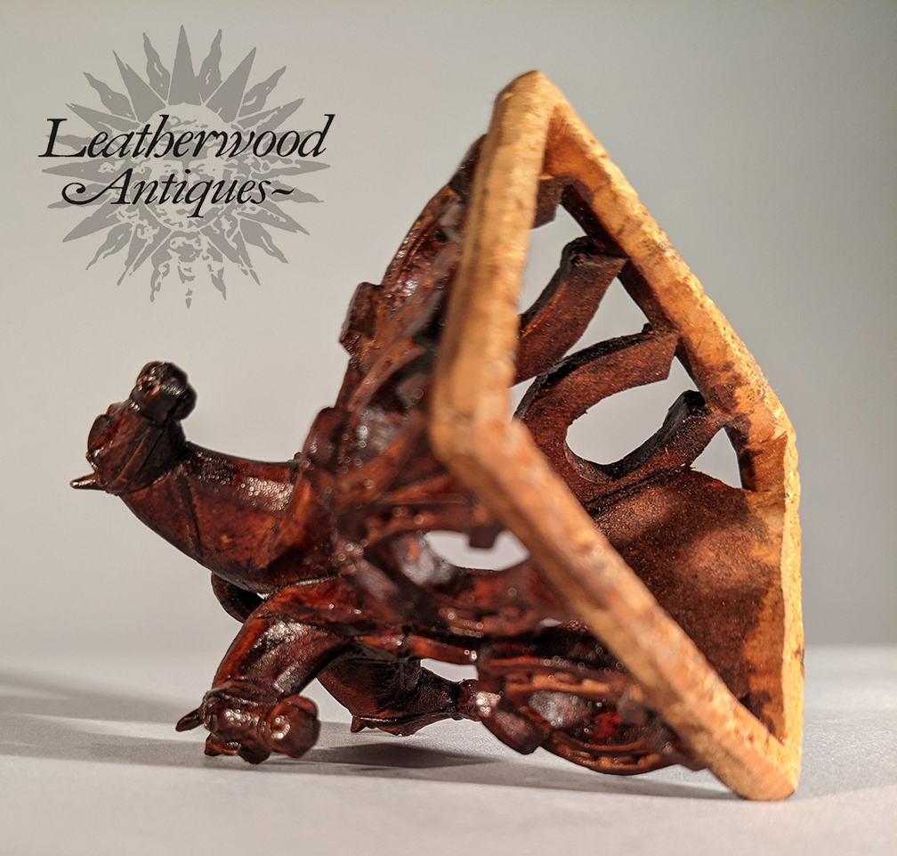 An unusual mystical carved reliquary with two kings holding wreath swag within their mouth and a face its tongue sticking out. Probably 18th c. Flemish..
