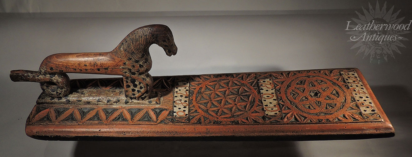 Carved & painted mangle board ~ the handle is a horse with an unusual rear on a trapezoidal board that is carved with geometric patterns and initialed and dated "MFS," "BOD," and 1780. Scandinavian.