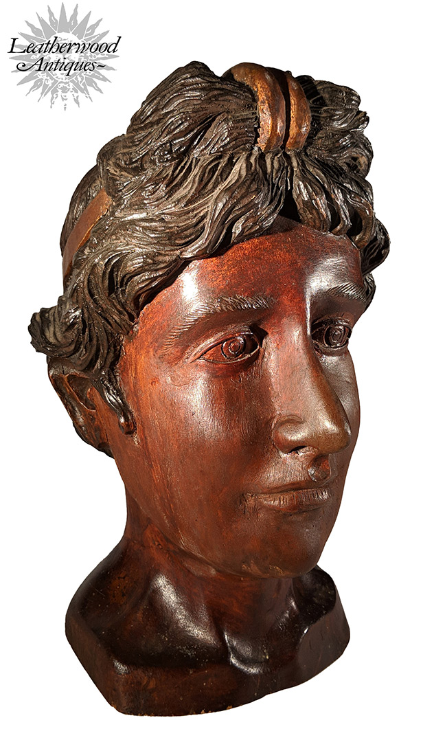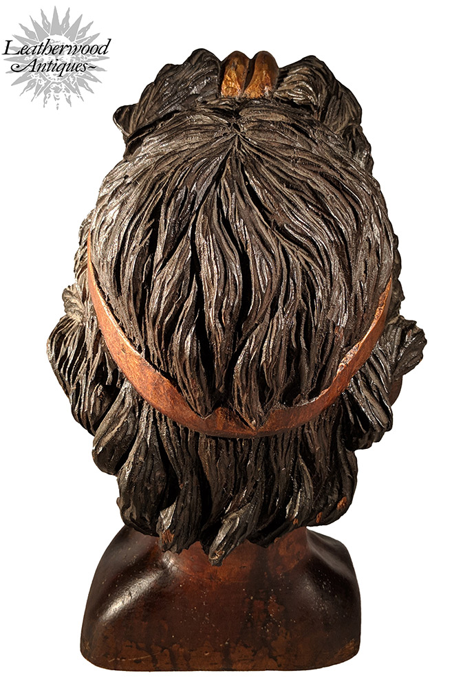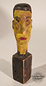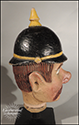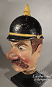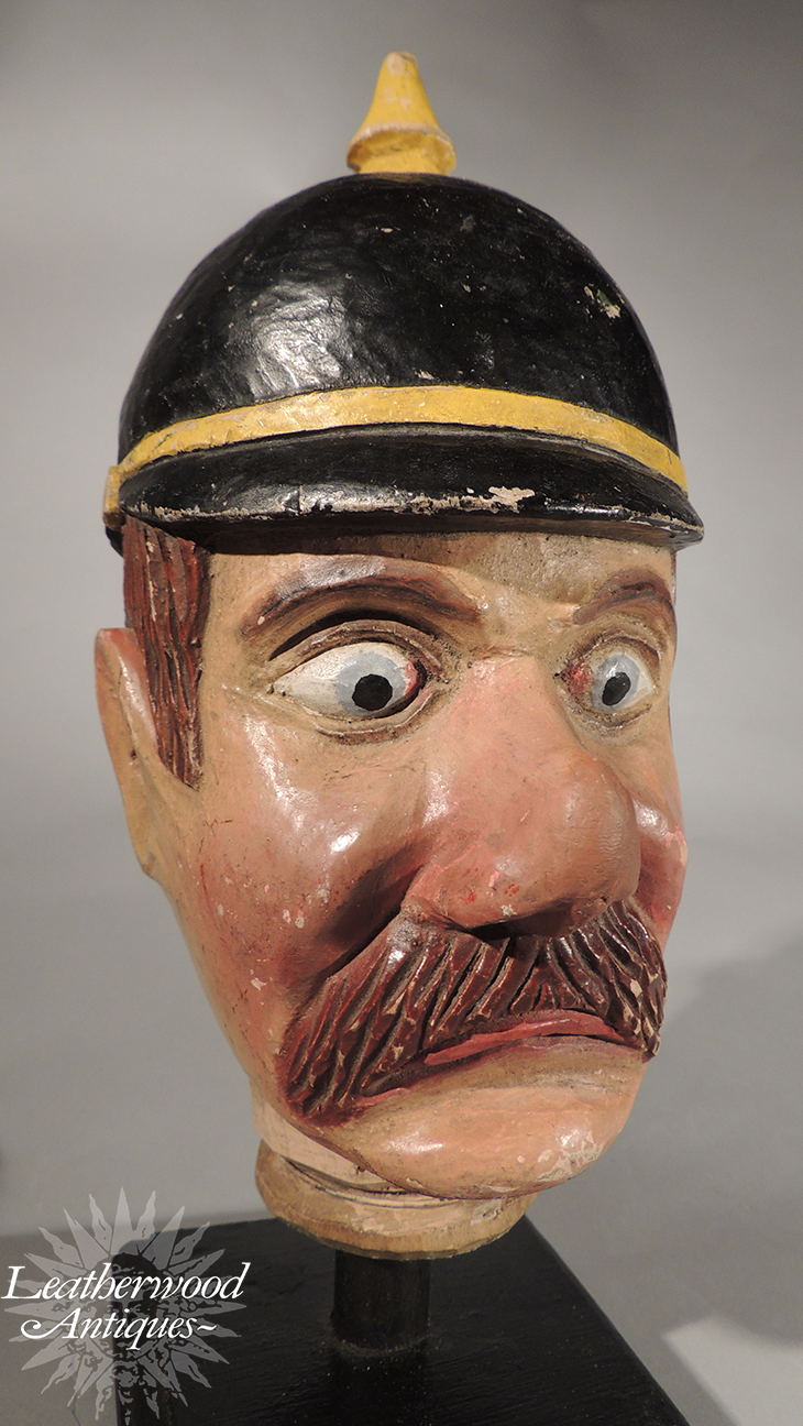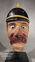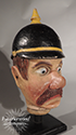 "Oh My!" A humorously carved & painted head of a Prussian soldier wearing a pickelhaube helmet with a surprised look. c. 1920.
