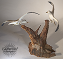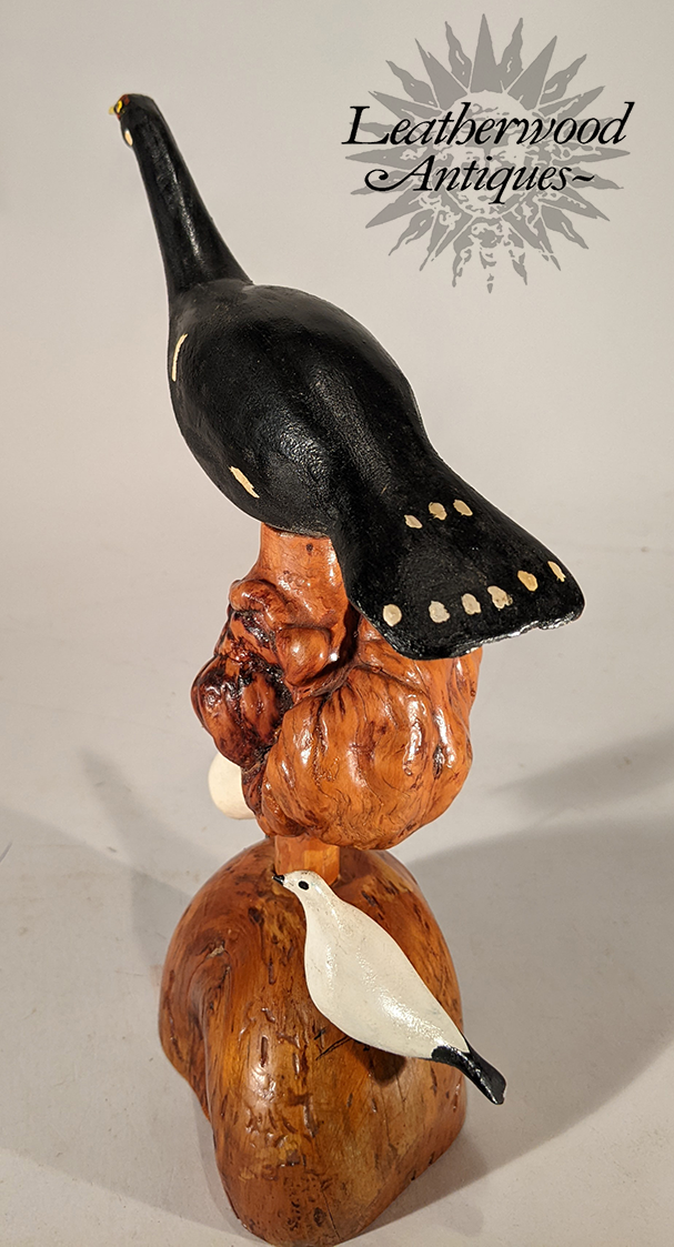 Two carved & painted American pipits on driftwood base, one with a nest. American, 20th Century.