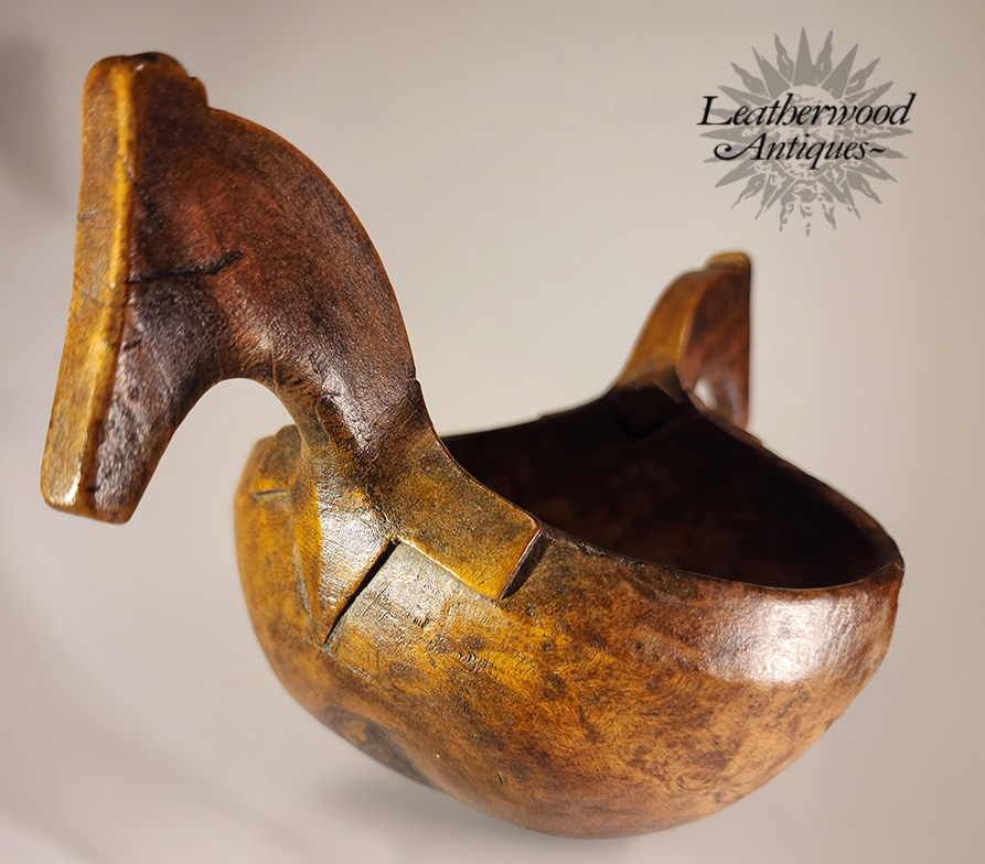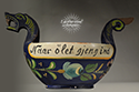 Carved & painted Norwegan ceremonial ale bowl written translation on bottom ~ Welcome friends to my house, Now we'll drink merrily. c. 1860.