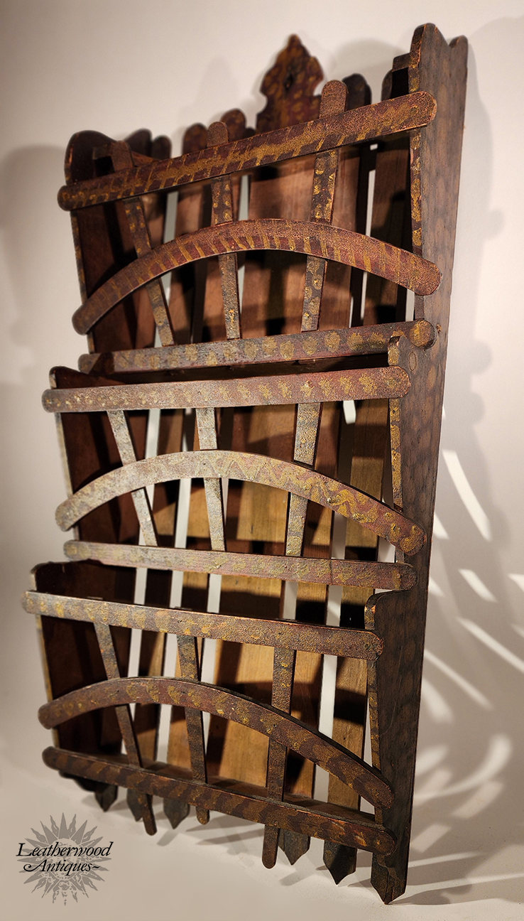 Loaded decorated folksy arched top two pocket wall hanging with rich variety of decorations. Overall mother-of-pearl inlay, various stars, circles, geometrical shapes. Stencils depicting musicians and stylized foliage. American, Late 19th Century.