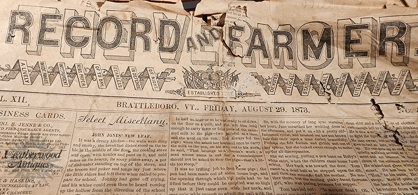 Charming faux grain-painted wooden violin case with pencil inscriptions on the interior lid & a copy of an old "Record and Farmer" newspaper from Battleboro, VT dated August 29, 1873.