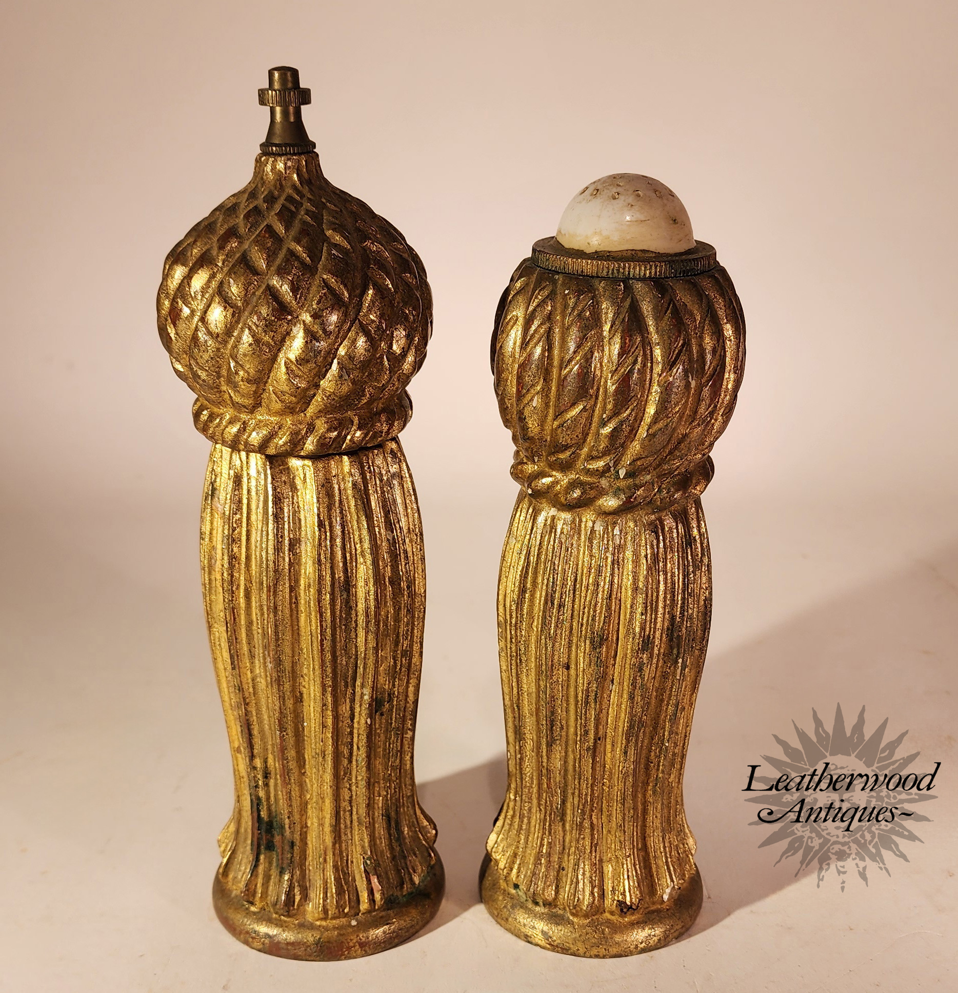 Fabulous pair of large carved & gilded salt & pepper shakers. Carved as faux large tassels with a rope tied around the ball. The salt shaker has a ceramic top and the pepper shaker has a cross finial.