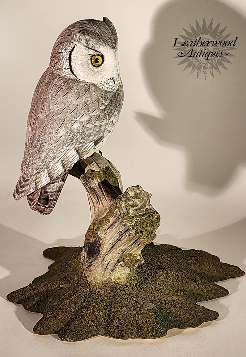 Exquisitely crafted vintage American white owl, meticulously carved and painted, resting on a branch with a green base.