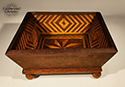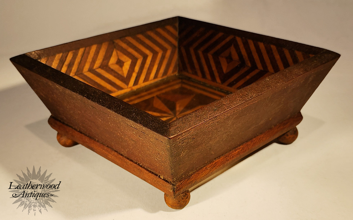 Dazzling inlaid decoration on the inside of this wooden square bowl on four button feet & stunning inlaid pinwheel on bottom covered in glass. American, 19th Century.