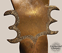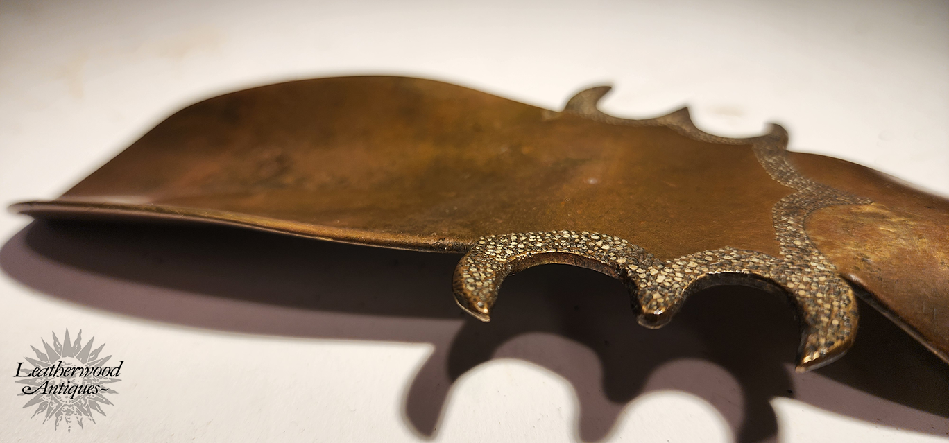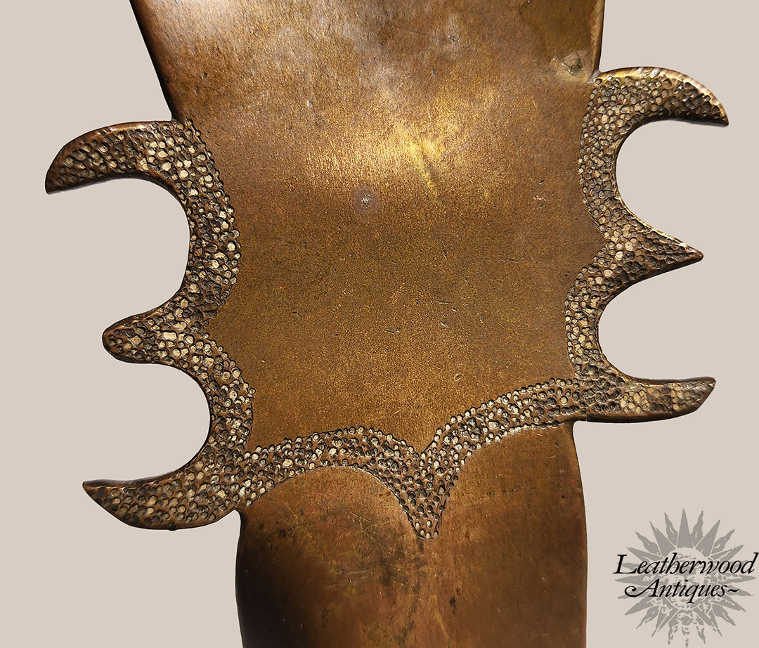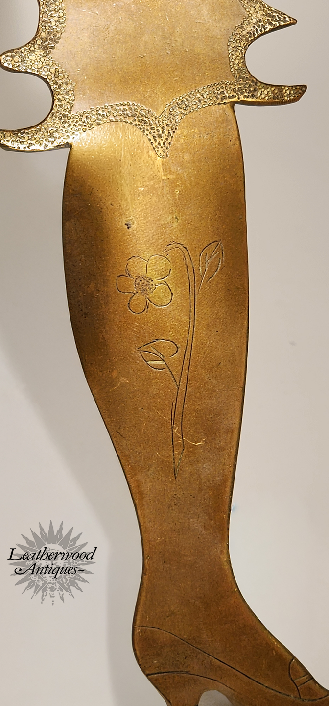 Unique and artful 19th c. brass shoehorn possibly Trench Art fashioned with lady leg and high heel shoe as a handle and decorated with flower and spiked projections with contrasting textures.