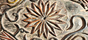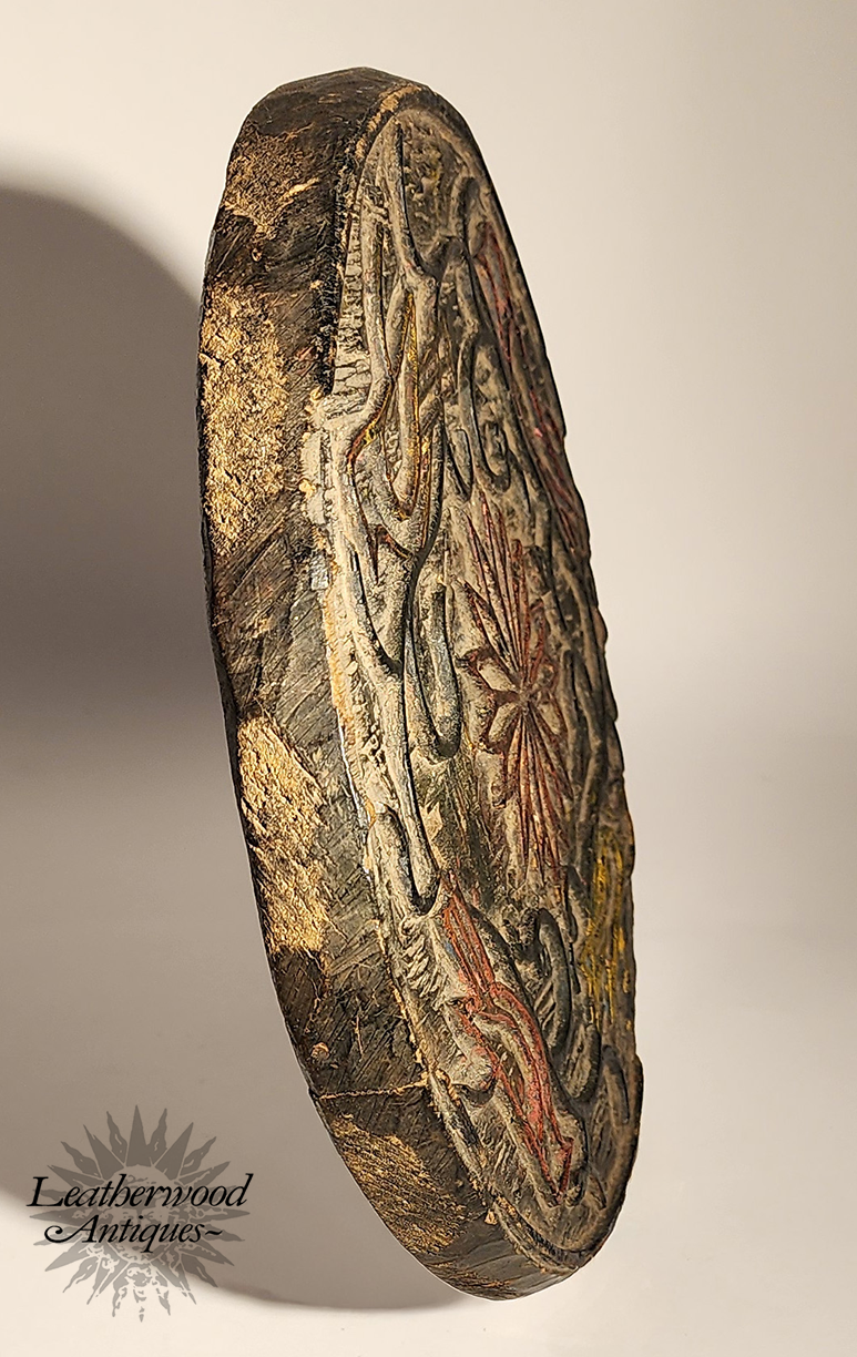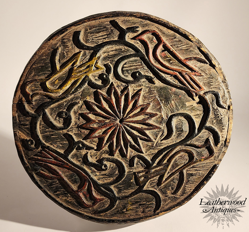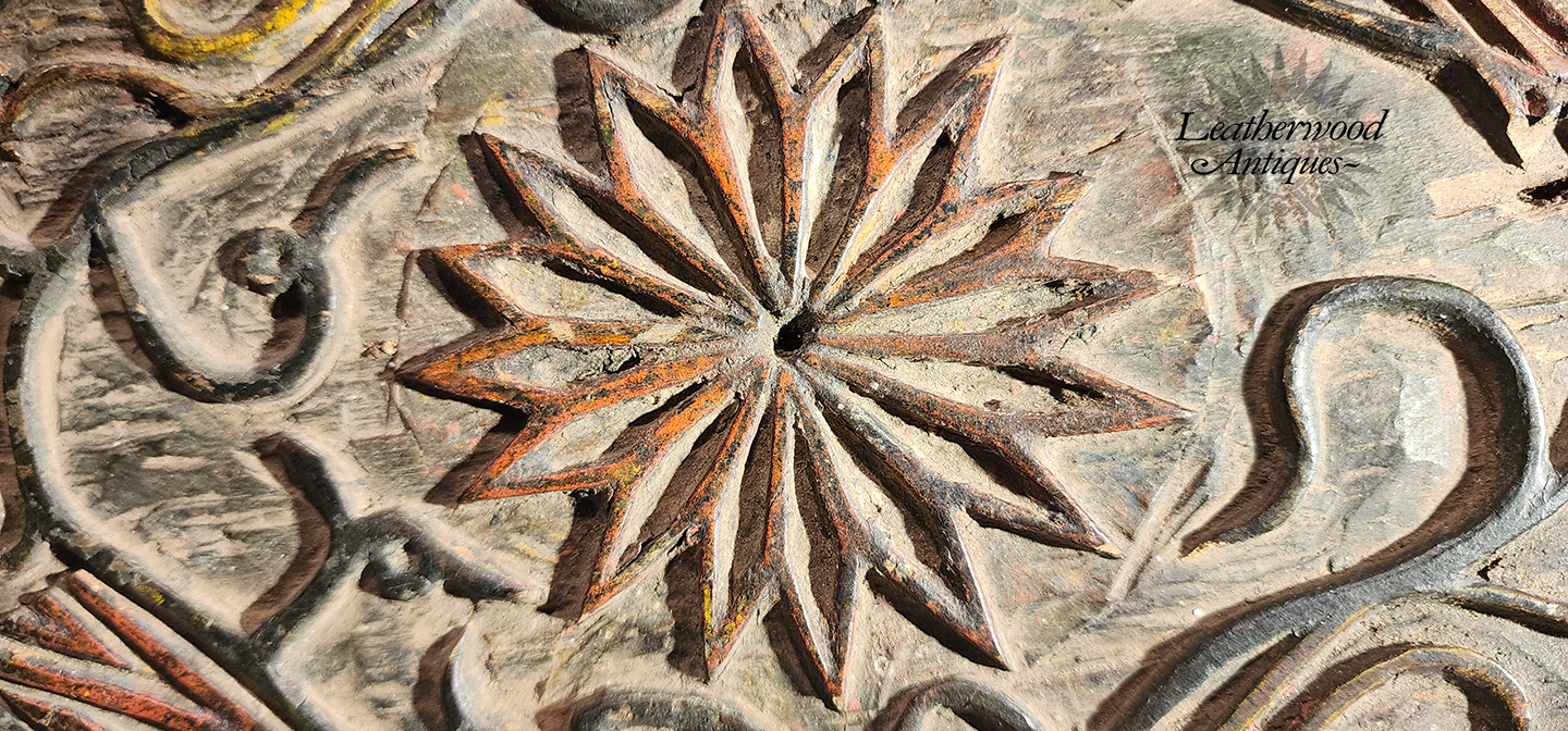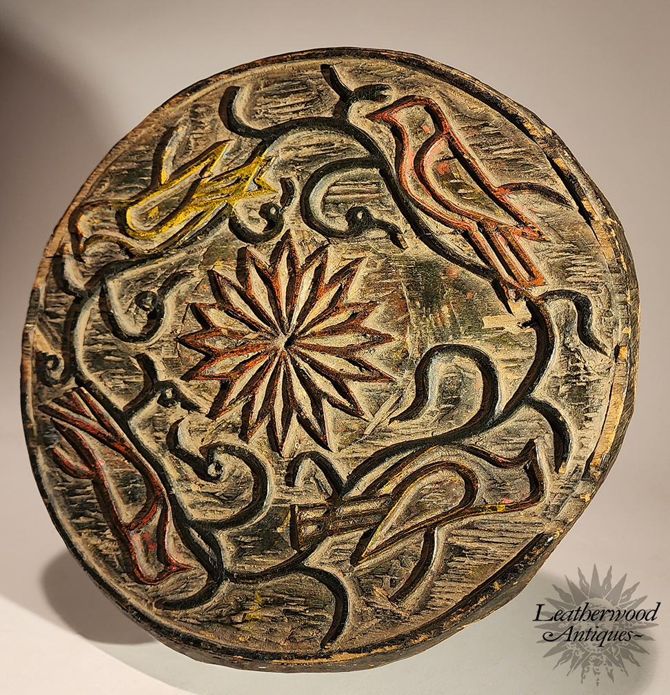 Unusual relief & painted wooden medallion round with birds, vines & a bold, multi-petaled central starflower.