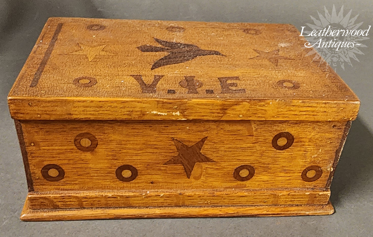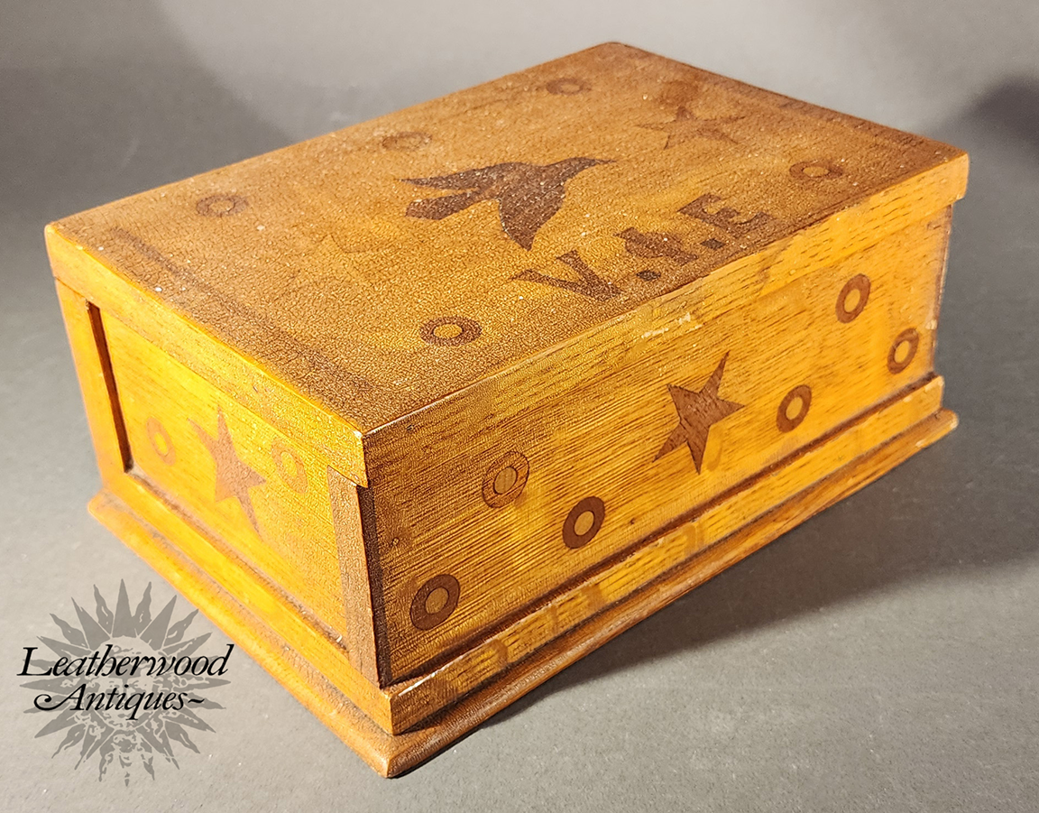 Naïve folky marquetry inlaid box rough dry surface with a bird, stars and round circles and the initials V. I. E on top. Stars and round circles adorn three sides. Dark blue velvet encompasses the inside box and lid. American, 19th c.
