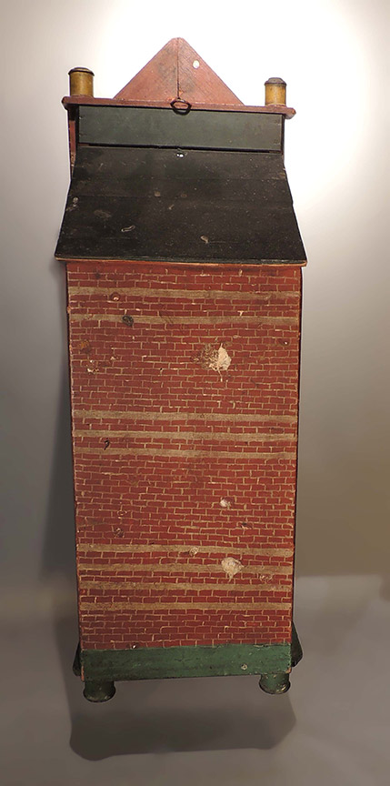 Faux Brick and Shingled Roof House-form Wall Cabinet, with towel rack below. American, Late 19th Century.