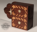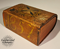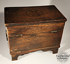 Miniature chest (could be a tea caddy) with bone inlay decoration including hearts on the front & inlaid star or flower in a circle on top lid & brass lion head handles. American, 19th Century.