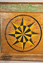 Red painted storage / traveling truck/box with the initials O.K.T. and some pleasing decorations and life scares (wear). Found in Maine.