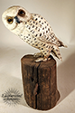 Carved & painted small vintage snow owl with glass eyes perched on a stump.