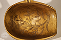 Handcrafted Birchbark basket with gentle curvature, scallop shaped articulated handle and scalloped rim.