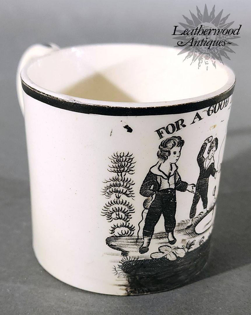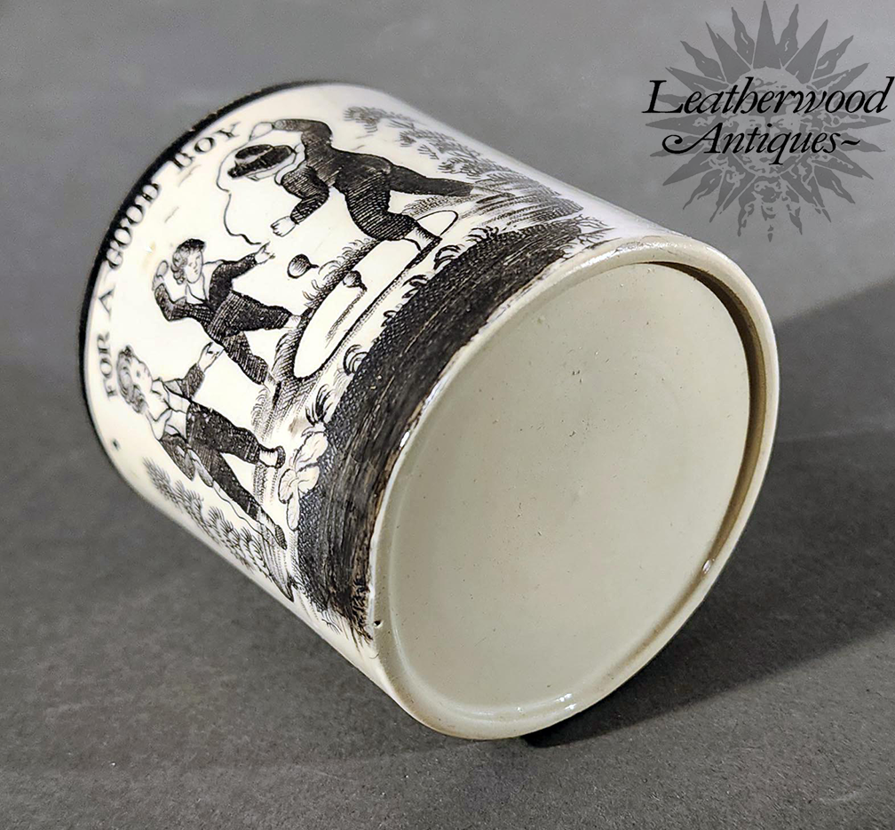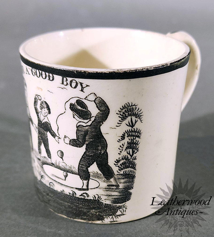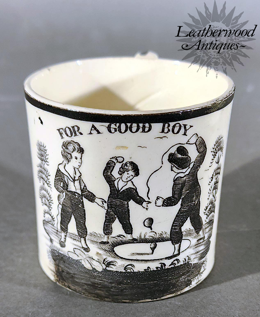 Staffordshire child’s mug, “For A Good Boy,” in a bold black transfer with three boys spinning a top. A clean early piece with lively detail and a touch of gentle praise. English c. 1840.
