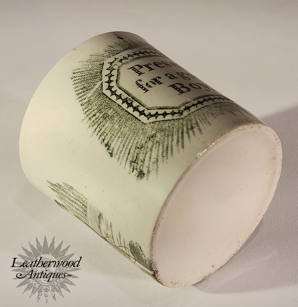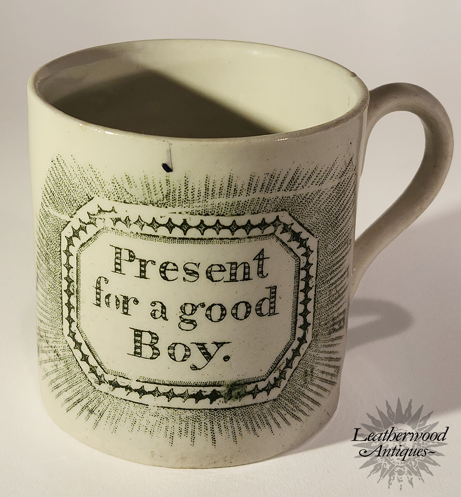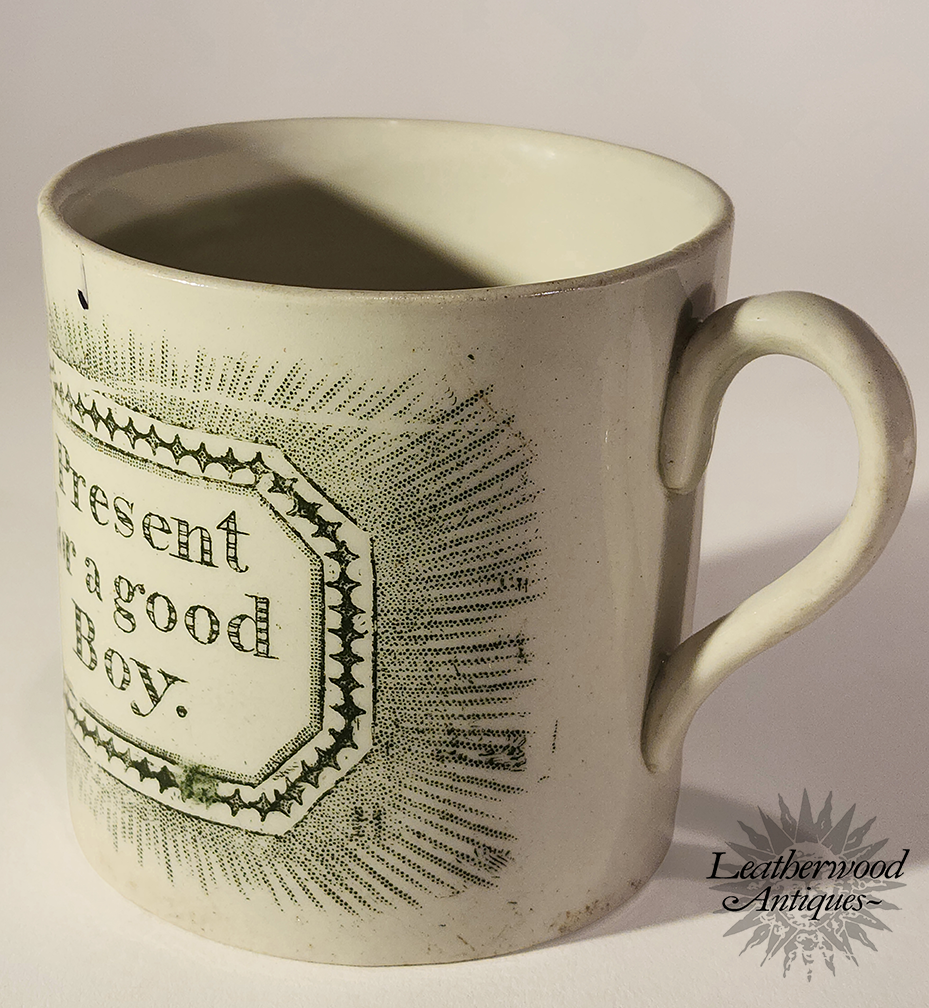 Staffordshire child’s mug, “For A Good Boy,” in a bold black transfer with three boys spinning a top. A clean early piece with lively detail and a touch of gentle praise. English c. 1840.