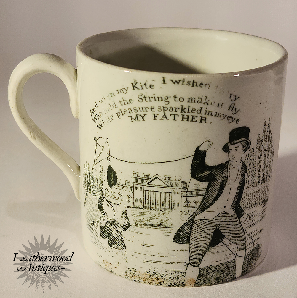 Child’s mug, “Present for a Good Boy,” with “My Father” and a tender kite‑flying verse on the reverse: And when my kite, I wishing to try, who held the String to make it fly, While pleasure sparked in my eye. English c. 1850.