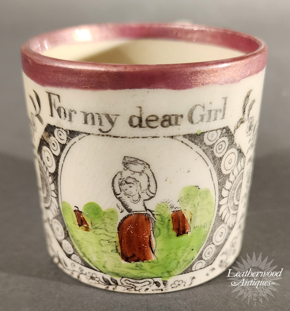 Early child’s mug inscribed “For My Dear Girl,” featuring a richly framed cartouche with a charming pastoral vignette. a small vessel full of affection and early domestic charm. A small vessel full of affection & early domestic charm. English c. 1840.