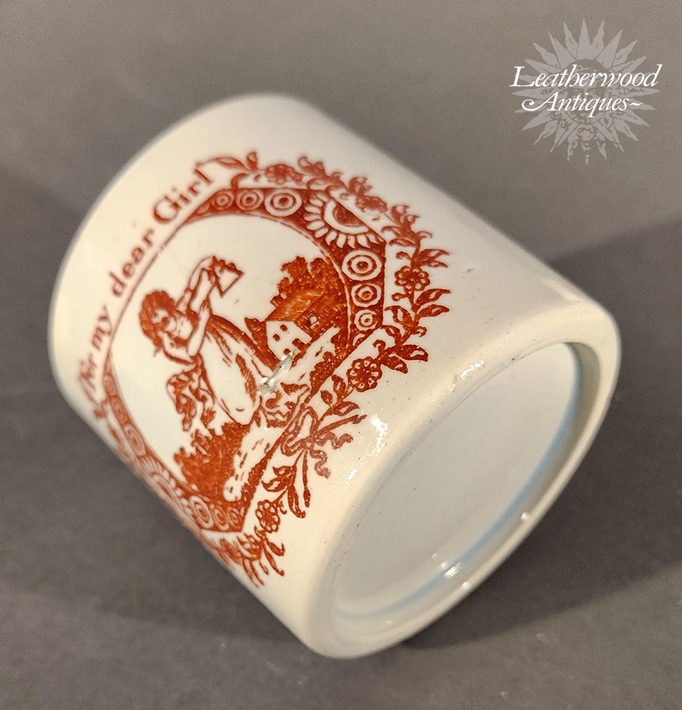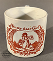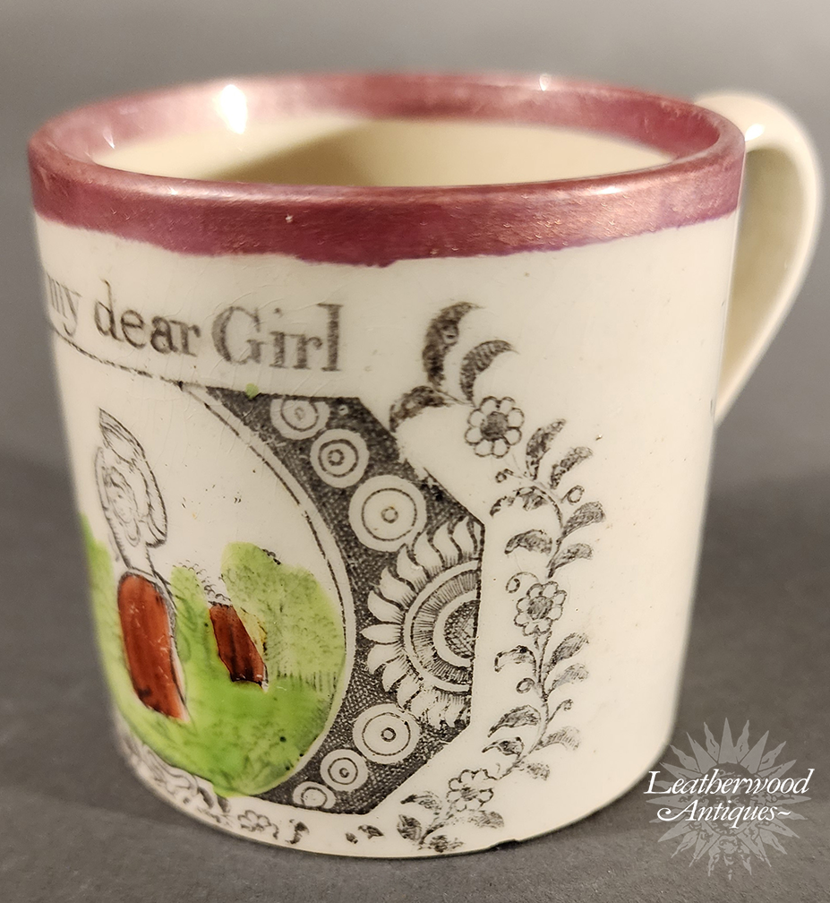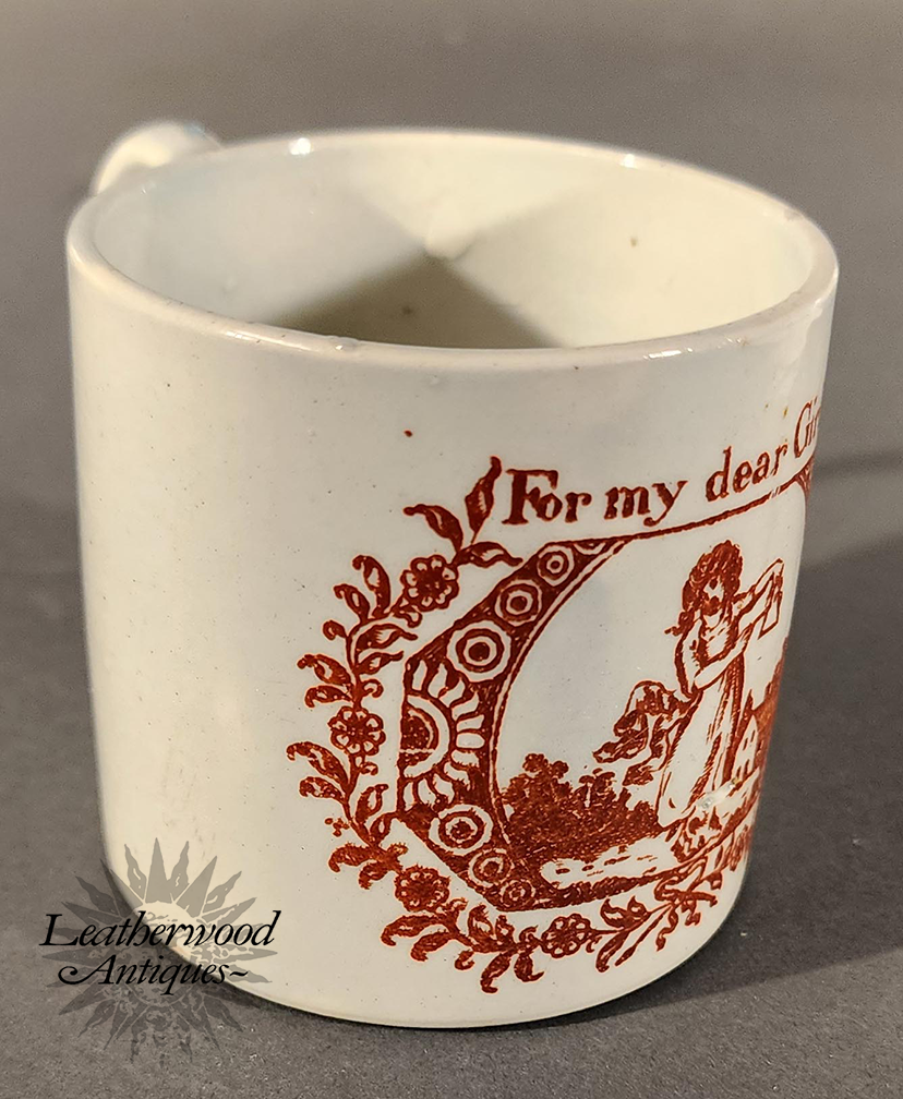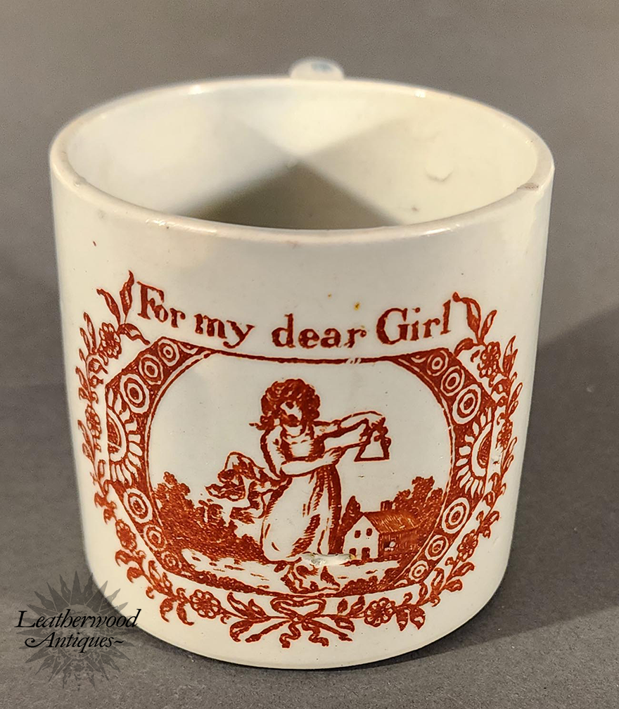 Child’s mug, “For my dear Girl,” with a sweet early vignette and rich red transfer. A touching named‑sentiment piece with strong color and classic appeal. English c. 1840.