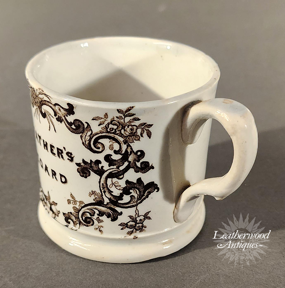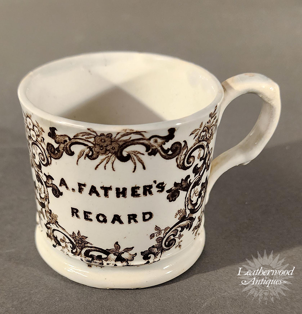 Early child’s mug with “A Father’s Regard” in a dark‑brown cartouche and ANN on the reverse. A warm, two‑sided motto piece with strong color and appealing sentiment. English, Early 19th Century.