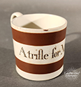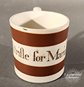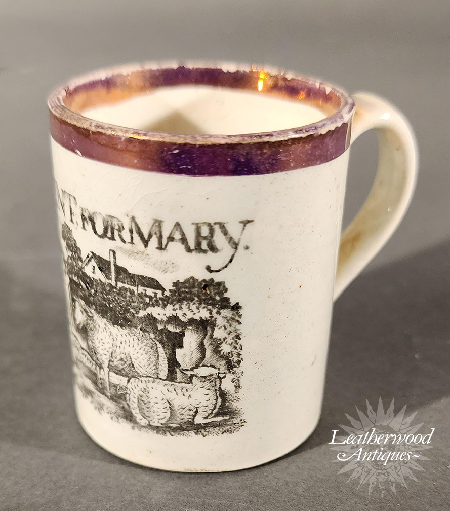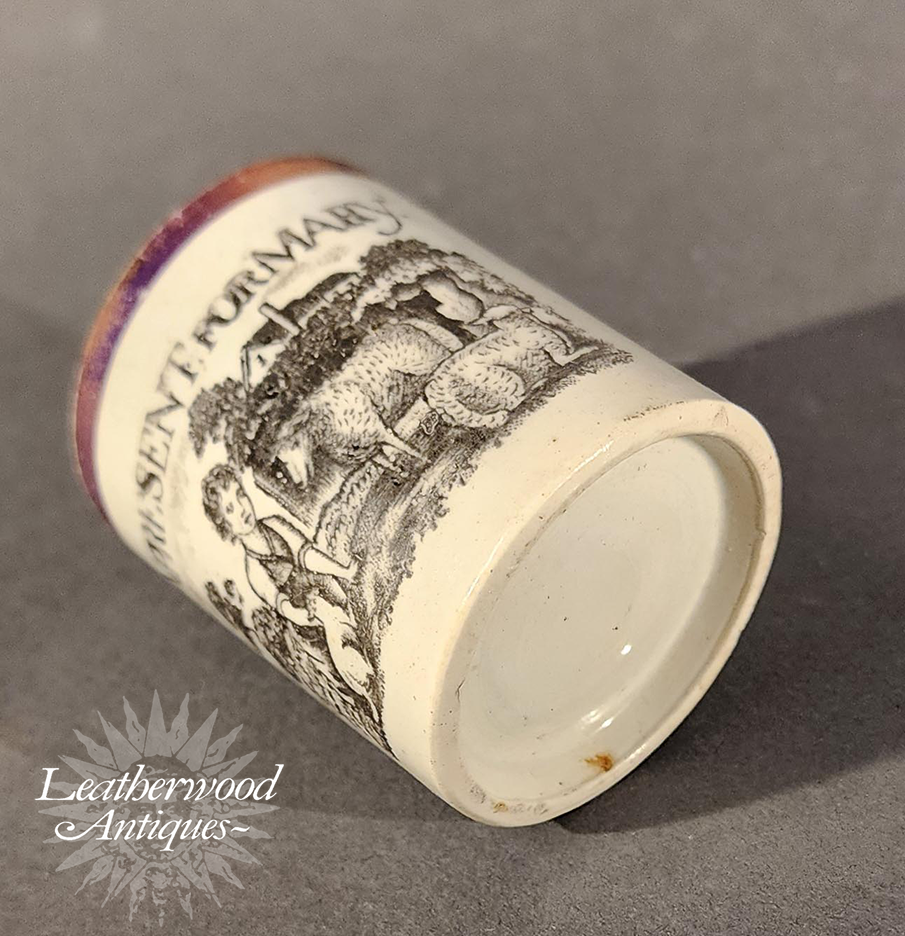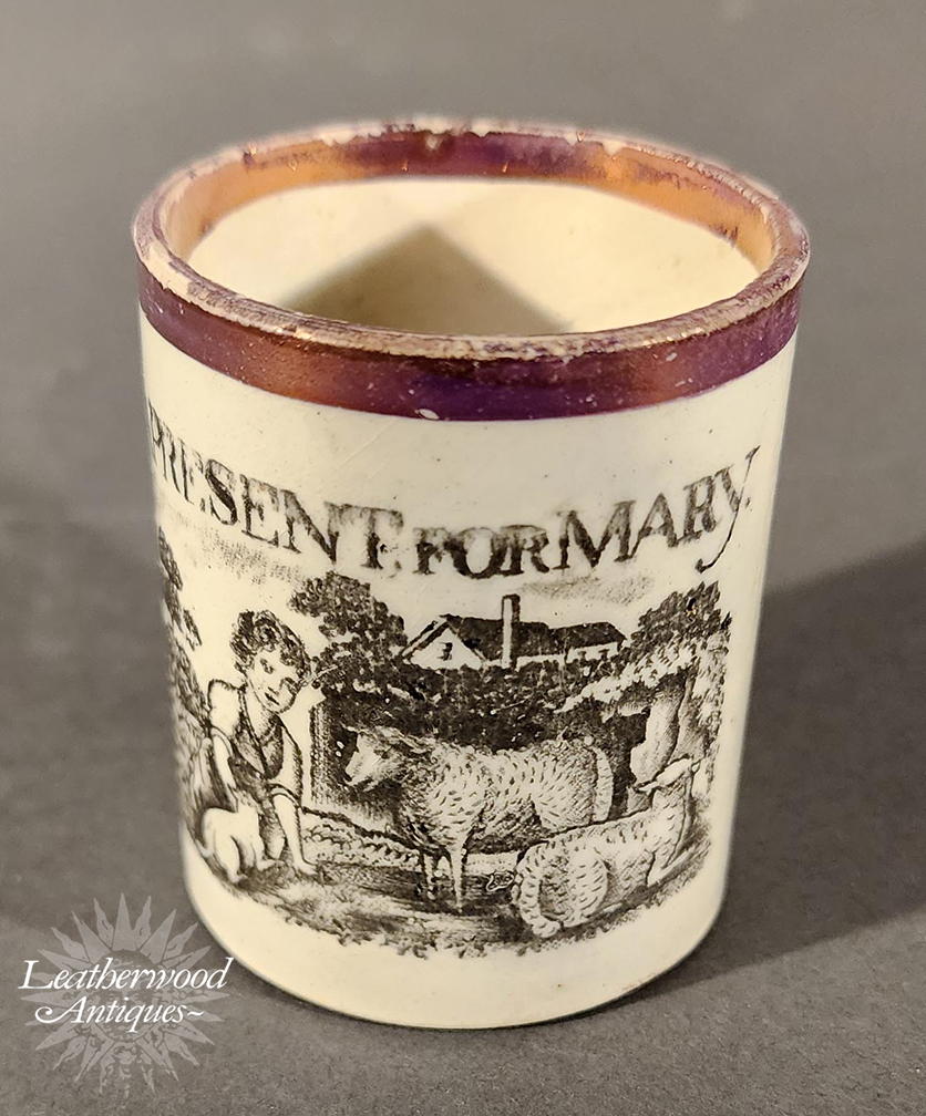 Staffordshire brown transfer child's mug "A Present for Mary". English c. 1860. Size:2 1/2" H x 2 1/2" D |
