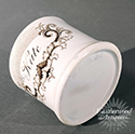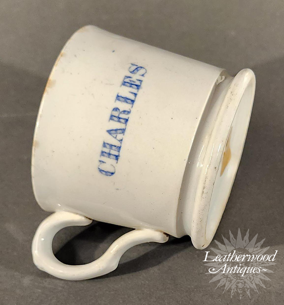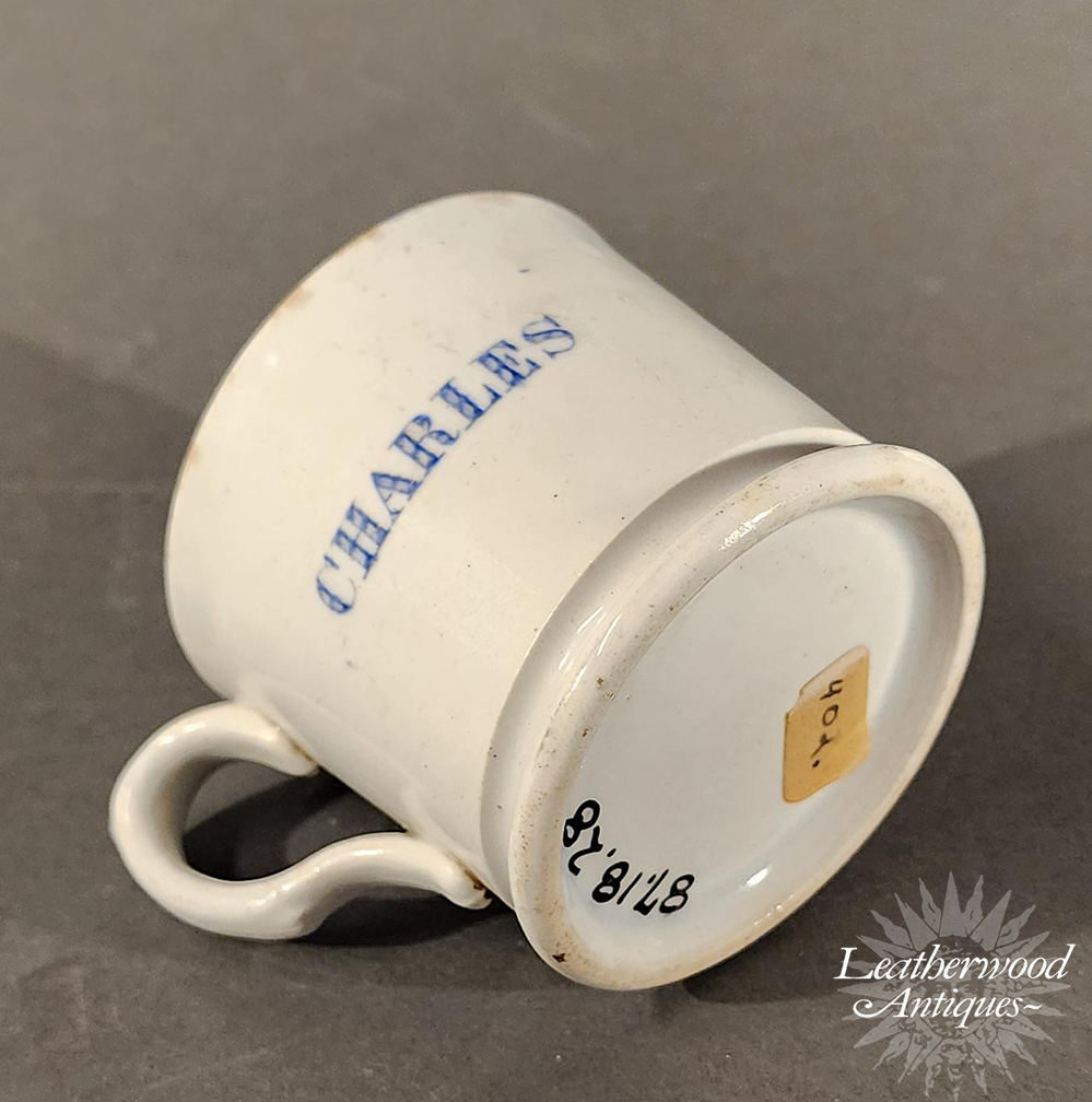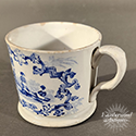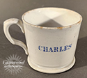 Child’s christening mug for Charles, with children on a seesaw in a blue cartouche on the reverse. A bright, appealing blue‑transfer example with both a named side and a playful vignette. English c. 1880. Size: 2 1/2" H x 2 3/4" D |