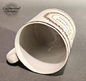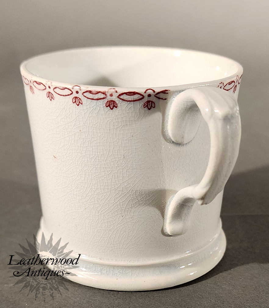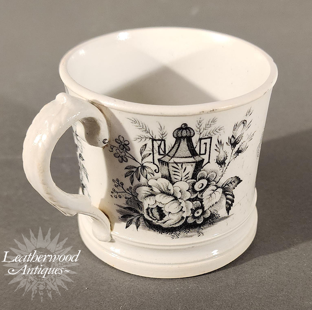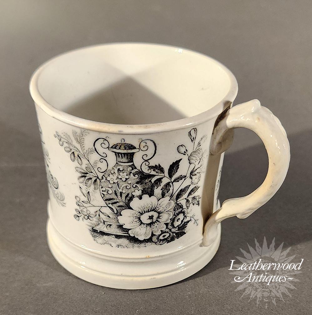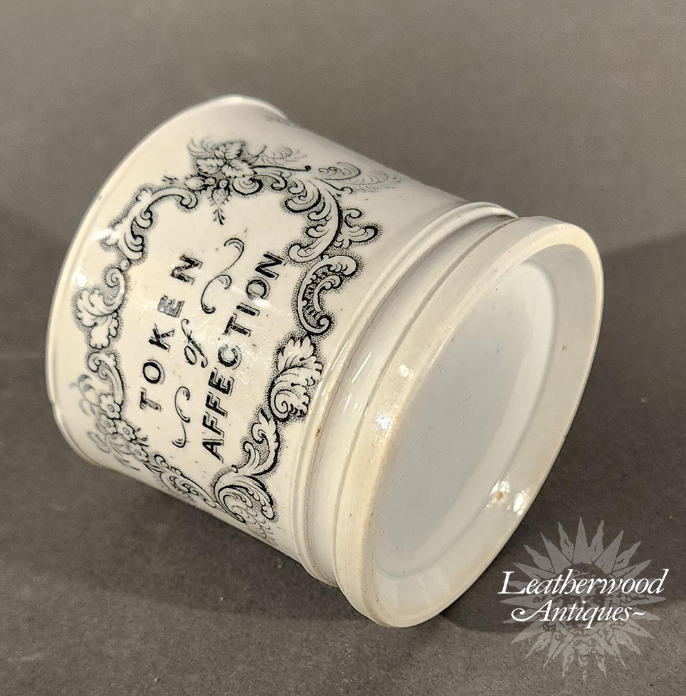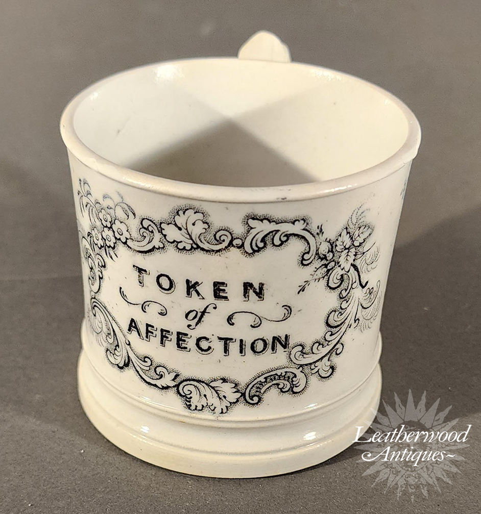 Child’s mug, “Token of Affection,” in a black vine cartouche, with an ornate urn‑and‑foliage motif on the reverse. A crisp early motto piece with strong contrast and classic sentiment. English c. 1860.