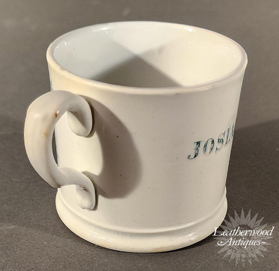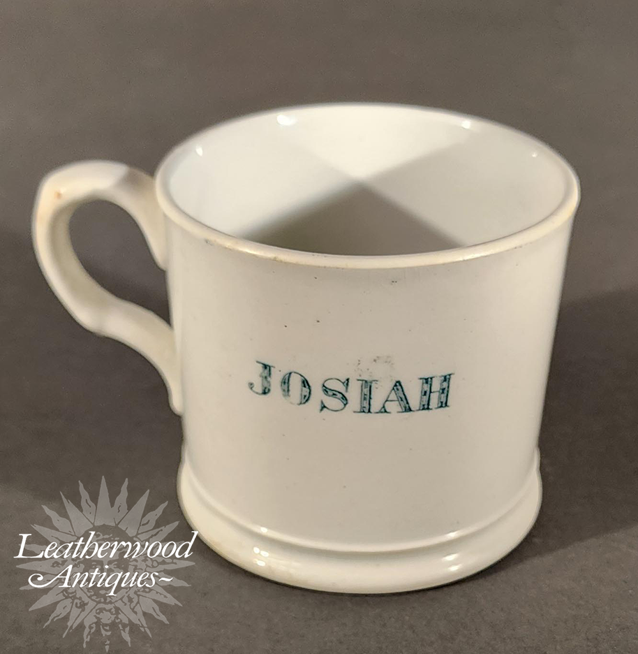 Child’s christening mug for Josiah, with “Merit Rewarded” on the reverse in a teal cartouche. A bright, two‑sided blue‑transfer example with strong color and classic moral charm. English c. 1840.