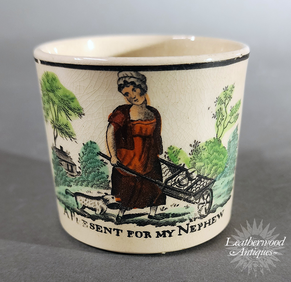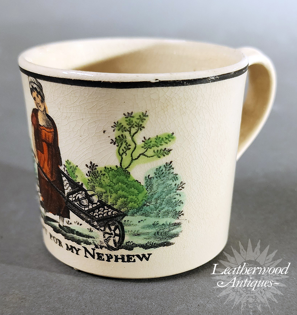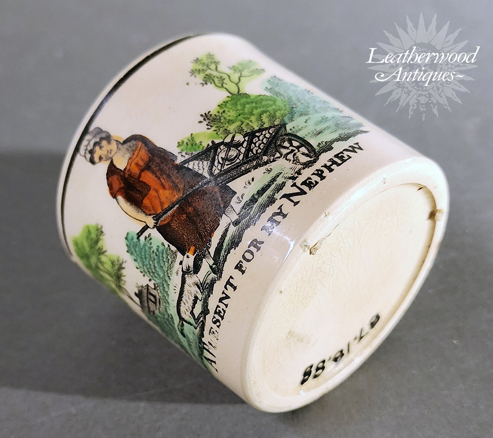 Child’s mug, “A Present for my Nephew,” with a colorful early vignette of a child outdoors. A bright, appealing 19th‑century example with strong sentiment and visual charm.. English c. 1840.