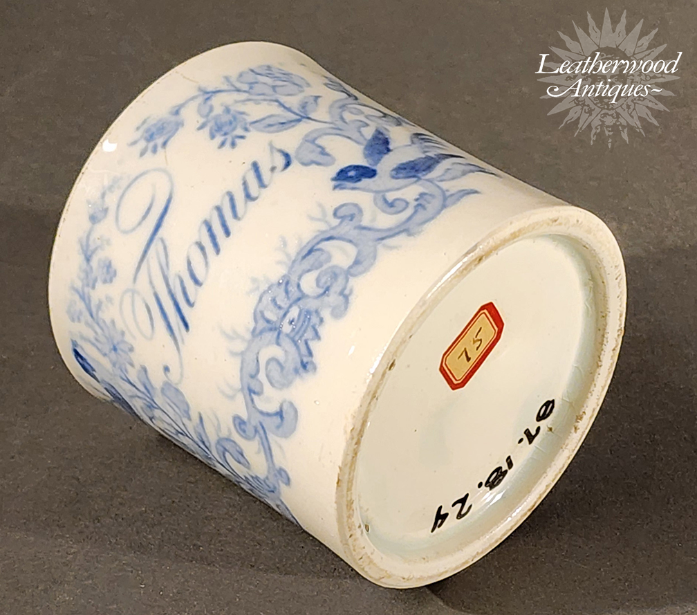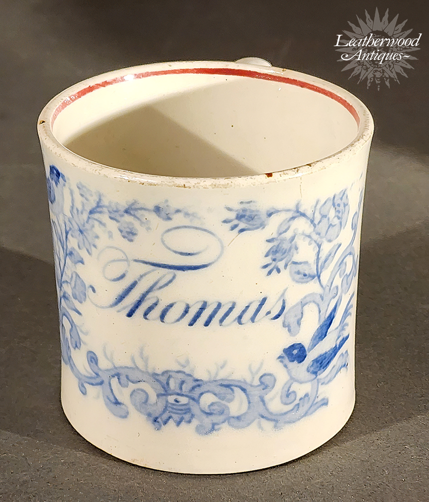 Crisp child’s christening mug for Thomas, framed in a light blue vine‑and‑bird cartouche, with sharp red accents to rim and handle. A clean early example with strong color, bright presence, and lovely personalized charm. English c. 1840.