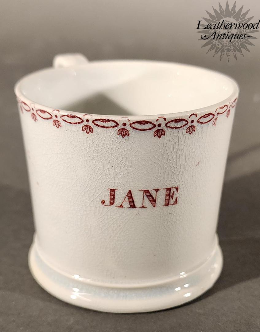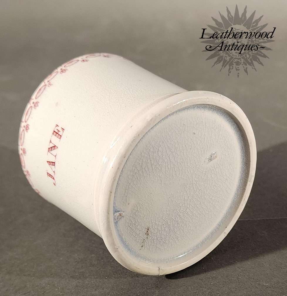 Child’s christening mug for Jane, printed in a warm maroon transfer with a charming rim border. A sweet early piece with simple, heartfelt presence. English c. 1840.