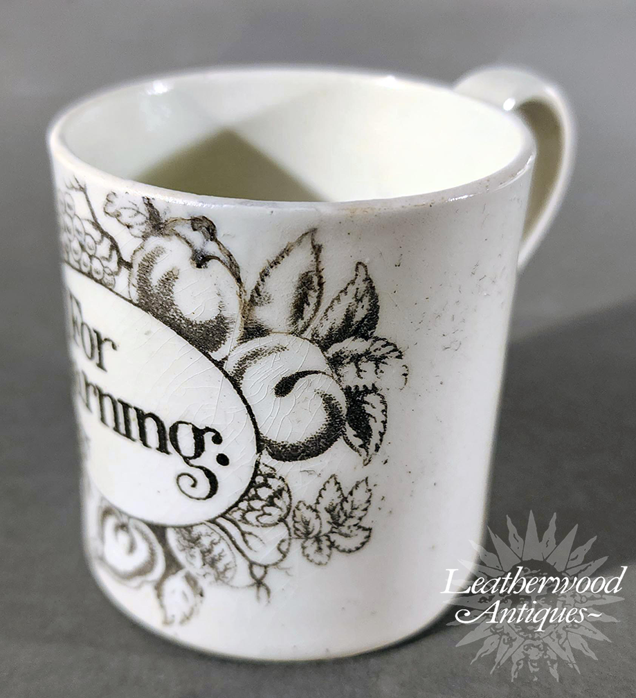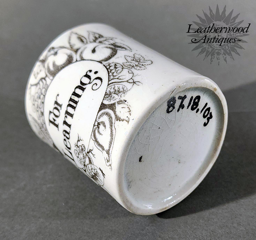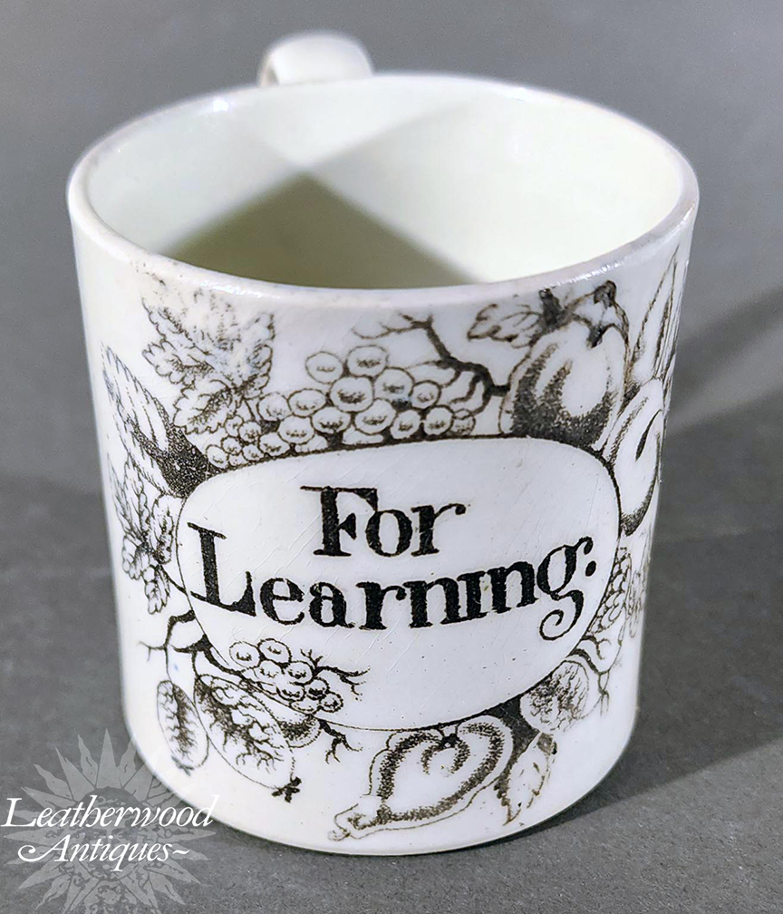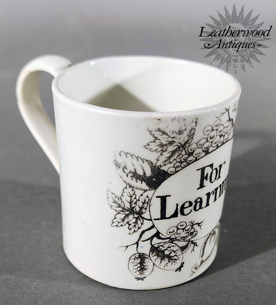 Diminutive child’s mug, “For Learning,” printed in a crisp black transfer within a lively fruit‑and‑foliate border. A charming early reminder of gentle instruction. English c. 1860.