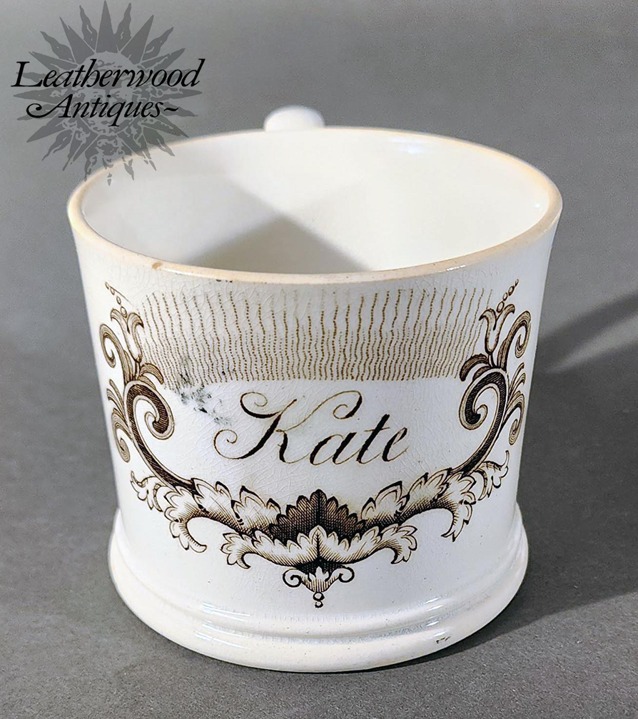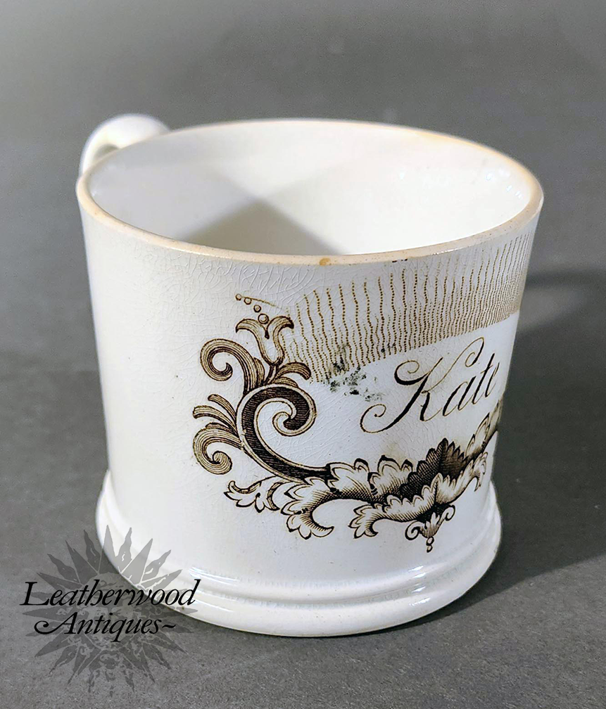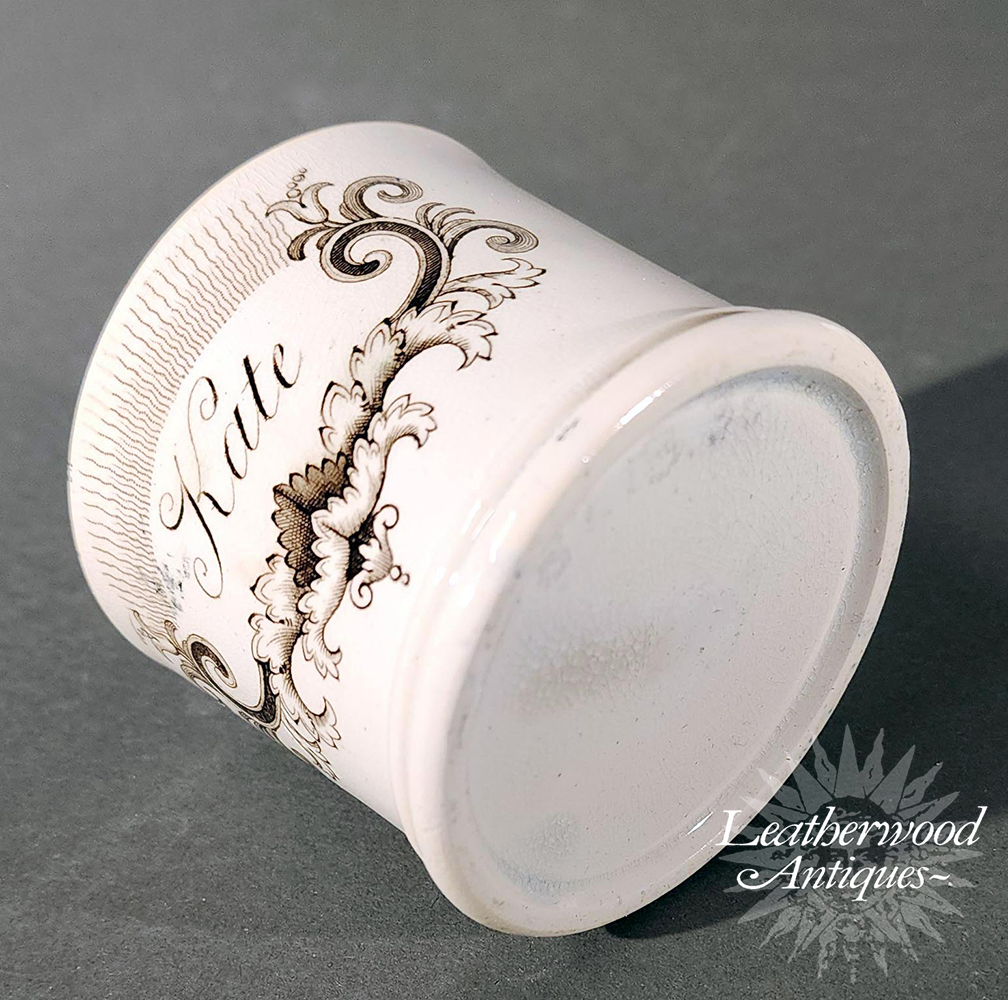 Child’s christening mug for Kate, decorated in rich brown scrollwork with elegant script. A clean early example with lovely presence, warm charm, and strong decorative appeal. English c. 1860.