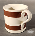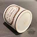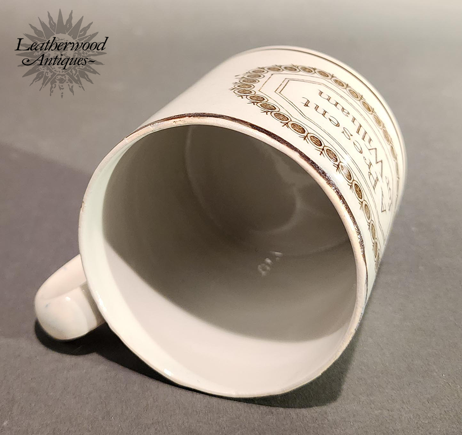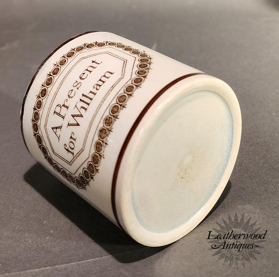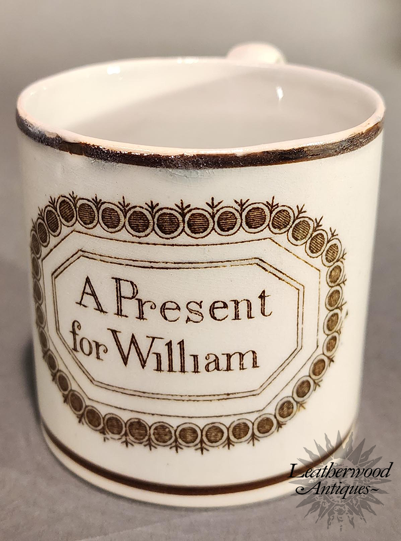 Early “A Present for William” mug, printed in an unusual chocolate‑brown transfer within a pleasing cartouche of spheres. A bright, appealing example with just a few tiny nicks to the rim. English c. 1830.