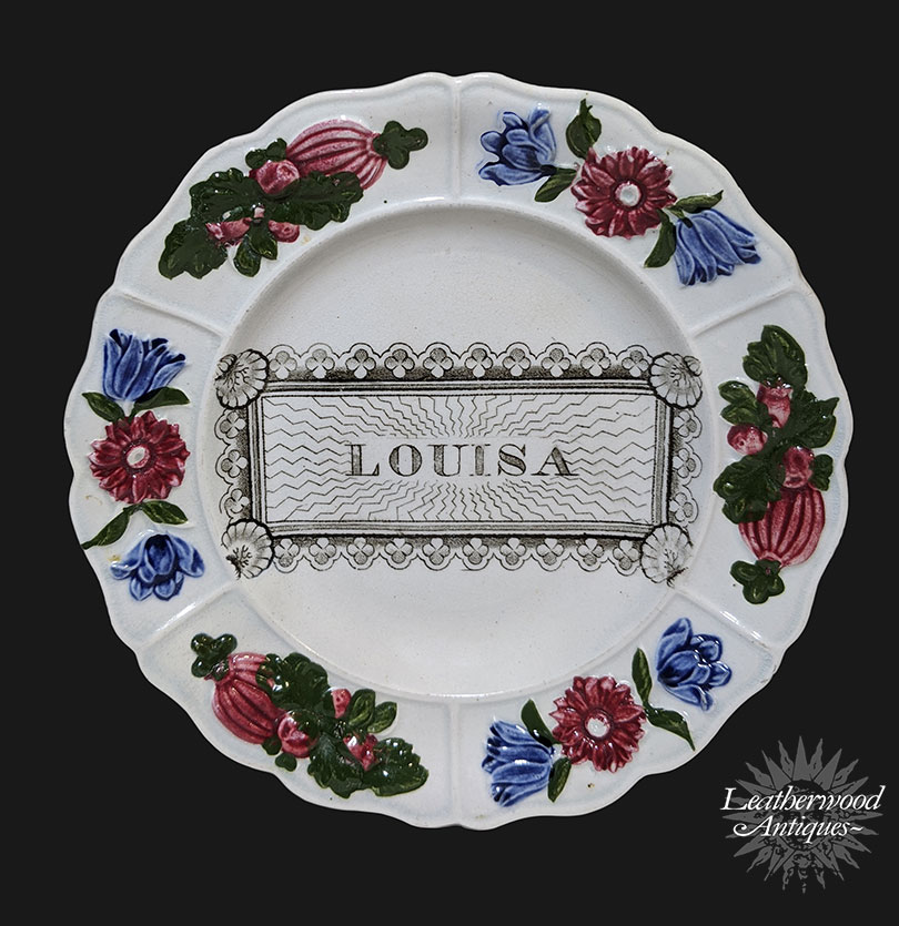 Child's christening plate with elegant flower border, Louisa ~ within a fancy cartouche. English c. 1830.
