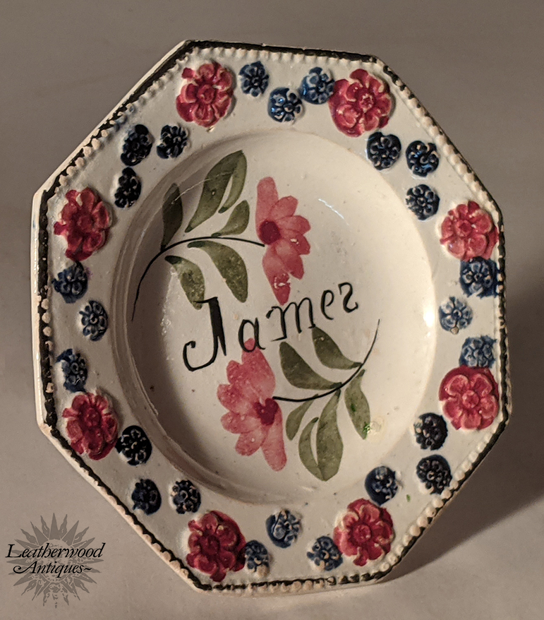 Rare christening child's plate ~ James colorful pleasing octagonal plate. English c. 1830.
