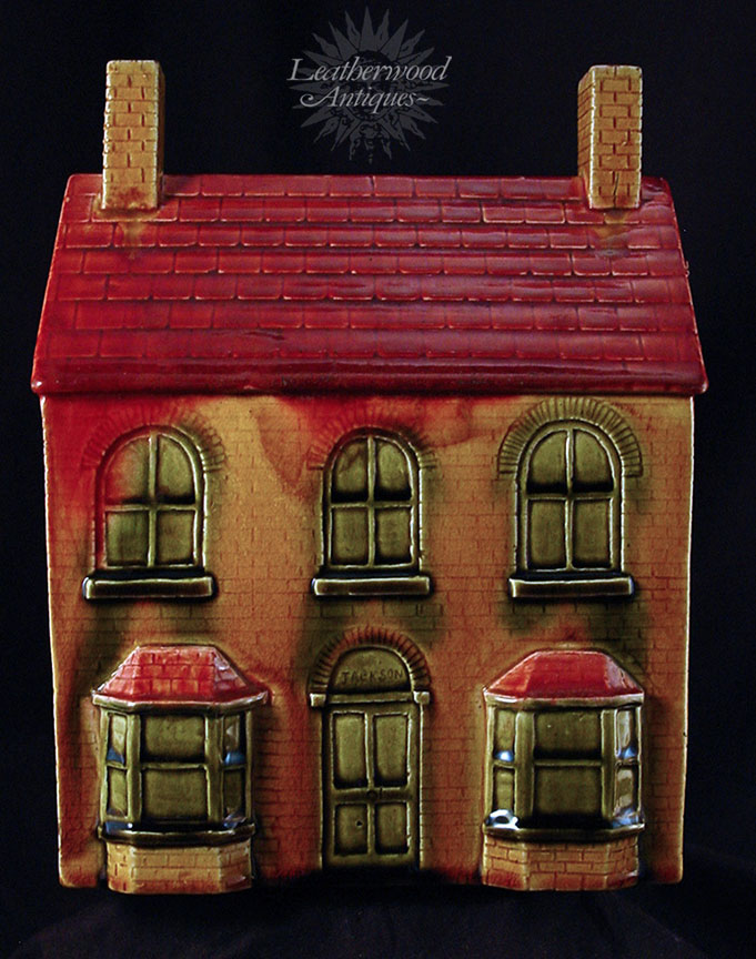 Whimsical Majolica glazed pottery red house with the name "JACKSON" above the entrance. Written on the bottom, "a Jackson's house built Feb 3rd 1888". English, Late 19th Century.