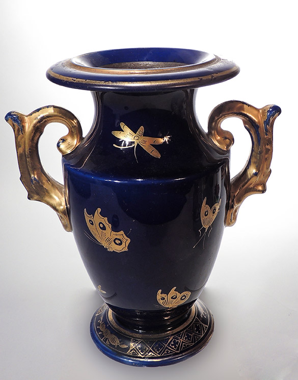 Elaborate cobalt blue gilt Mason Vase with gilt edges on rim and handles decorated with floral gilt designs. English c. 1820.