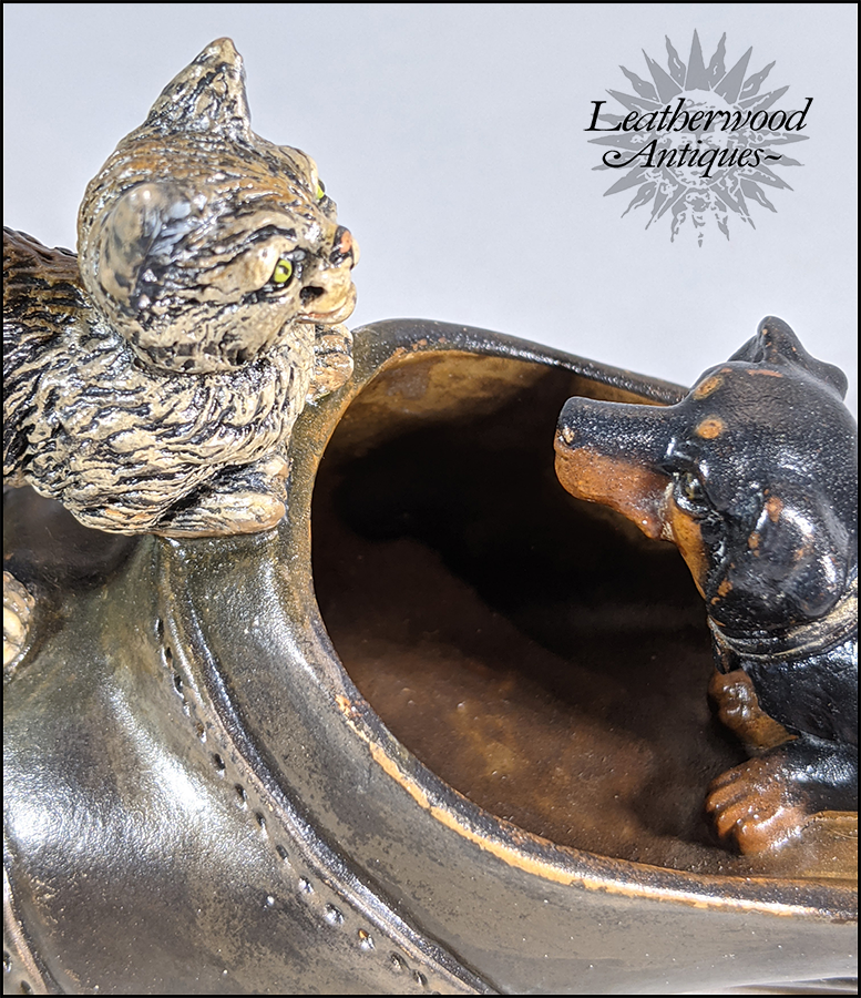 Cold-painted terracotta sculpture of slipper housing a dachshund & cat at play. Austria, Early 1900.