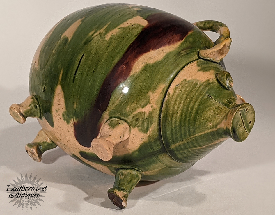 Unusual cat tea pot with majolica-type glaze. Signed on base. American, Early 1900.
