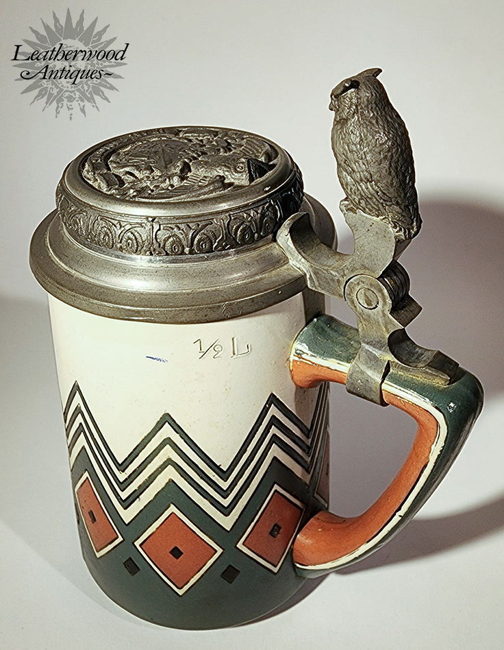 Stylish Art Deco stein with sharp geometrical design & a standing pewter owl attached to a remarkable relief of a spread-winged owl & unusual German crest.