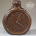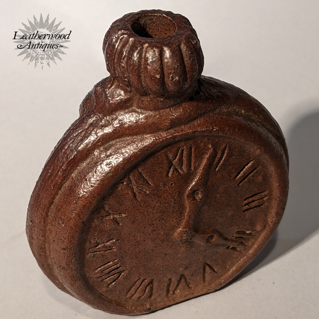 Small brown-glazed flask styled as a FAUX WATCH, circa 1840.