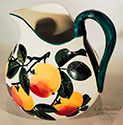 Bold brightly colored WEMYSS jug with peaches on branches, green handle & rim. Maker's mark on bottom. WEMYSS is collected by the British Royal Family. English c. 1890.