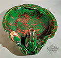 Oversize rare Weller Coppertone frog & lily bowl. The dish with deep coral, green colors and a pottery flower frog that can sit inside the bowl. American c. 1930