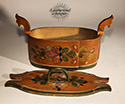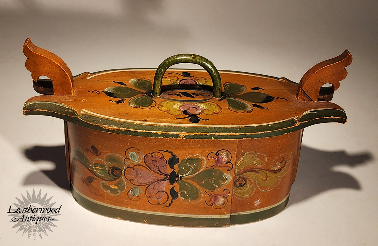 “Til Erindring” painted on this rosemaling bend box. It is a common phrase translate to 'In Loving Memory" which is on many Scandinavian folky objects. c. 1880.