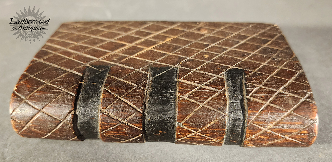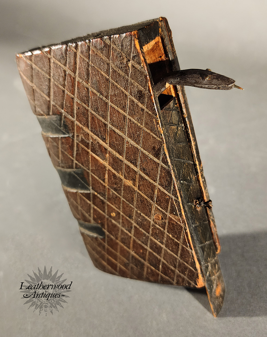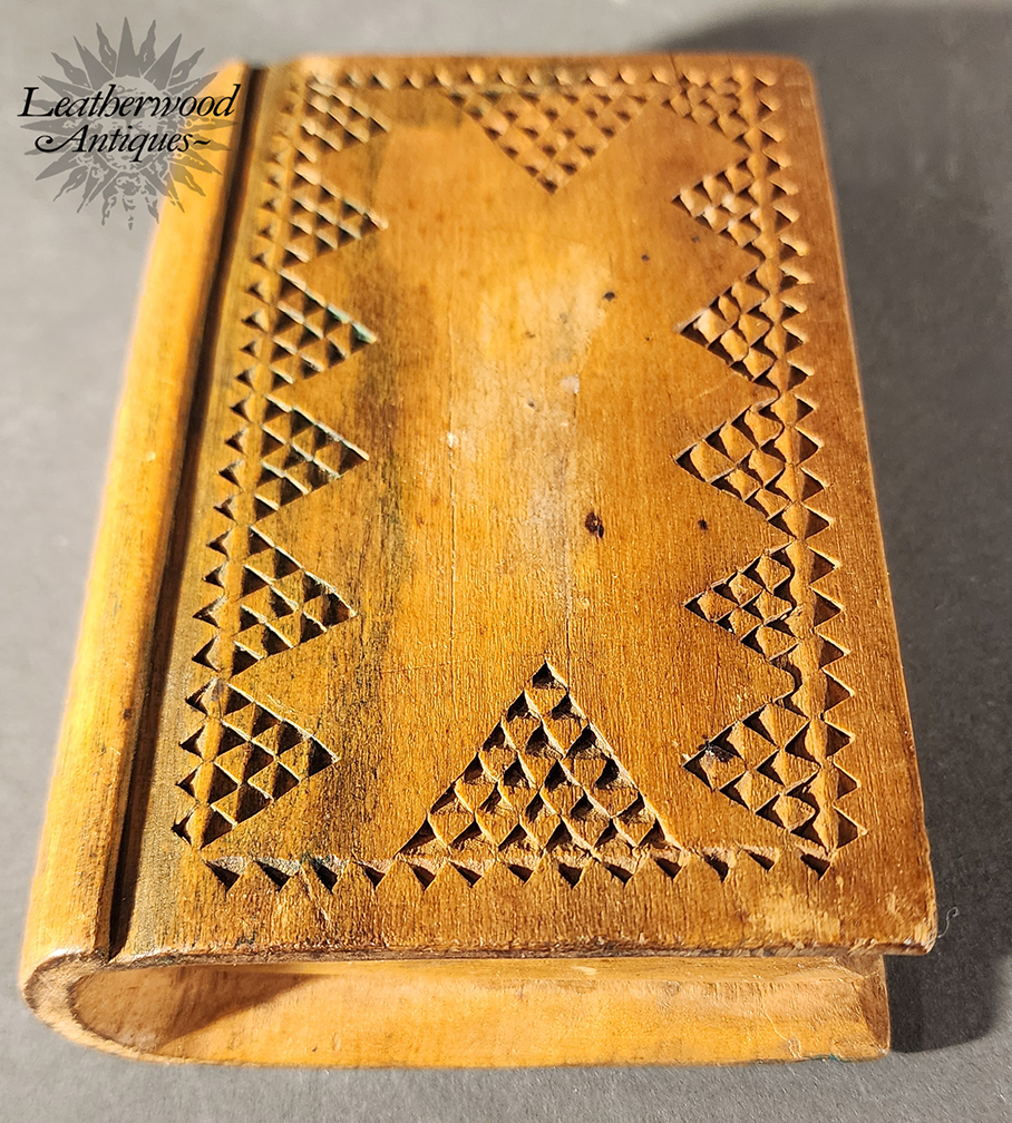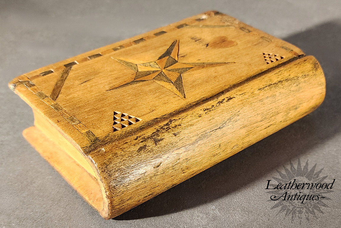 19th c. American folky and unusual book shaped spruce gum box with wonderful, star and heart inlays and geometric chip carving on the other side.