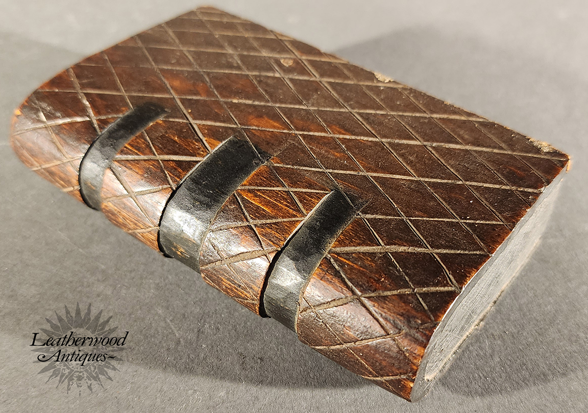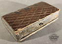 HORN & brass book shaped snuff box with inked engraved decorations heart, stars & geometrics. English c. 1830.