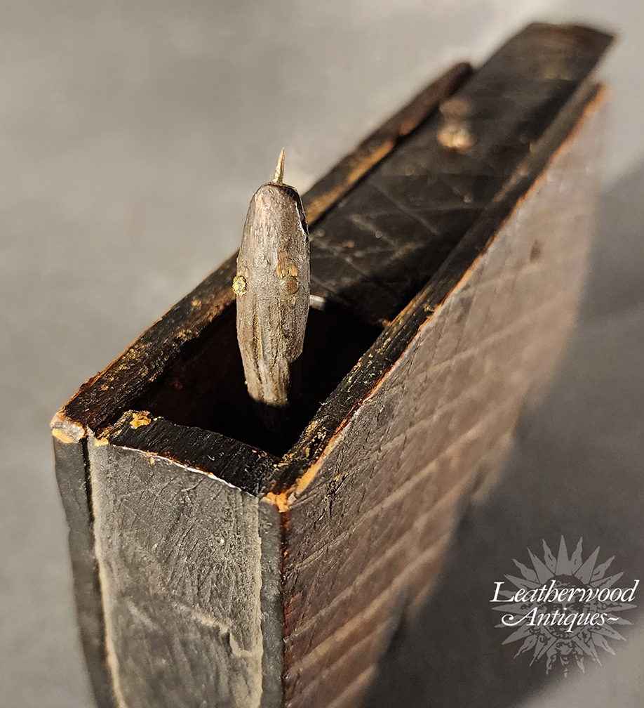 19th c. American naïve folky whimsy book shaped box with pop-out snake tied to the lid opening.