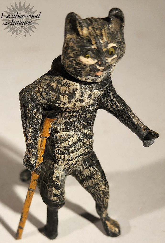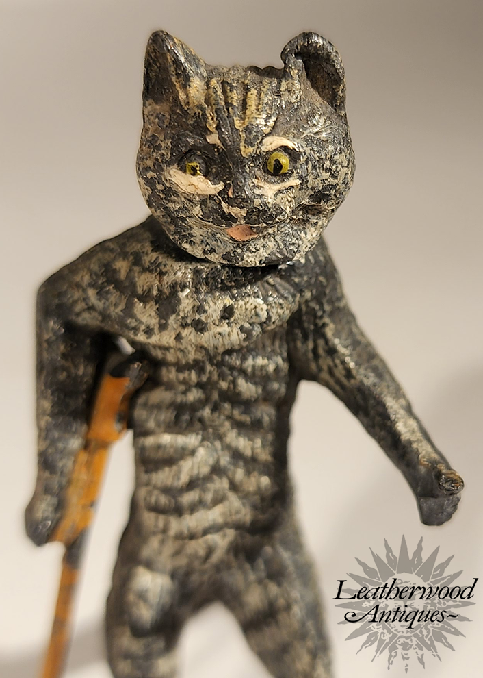 Bubble head cat nodder with peg leg on a crutch - in cold-painted lead. Austria c. 1900.
