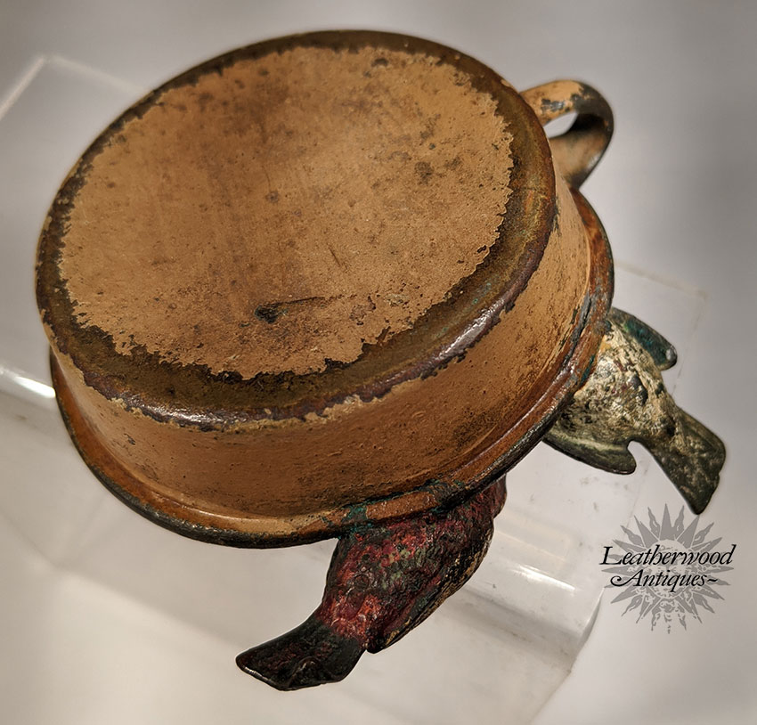 Cold-painted VB chamber stick depicting a songbird on a lily pad. Marked "Geschutz" in two locations. Late 19th Century.